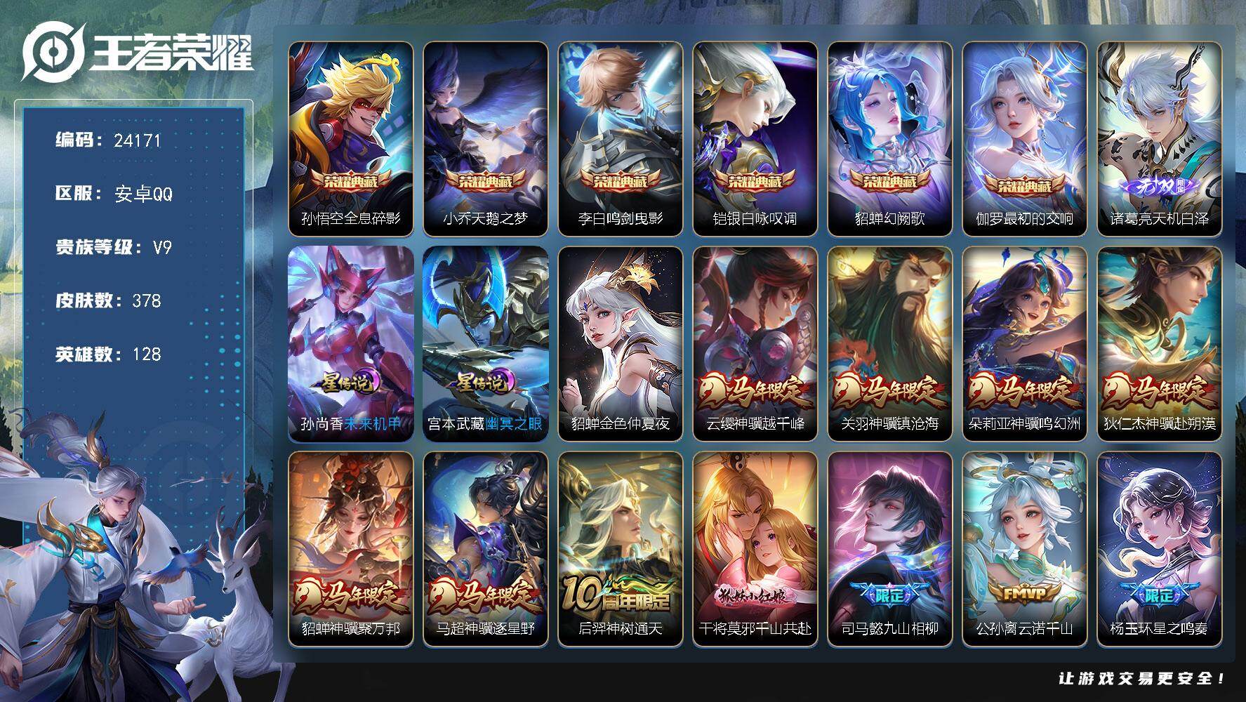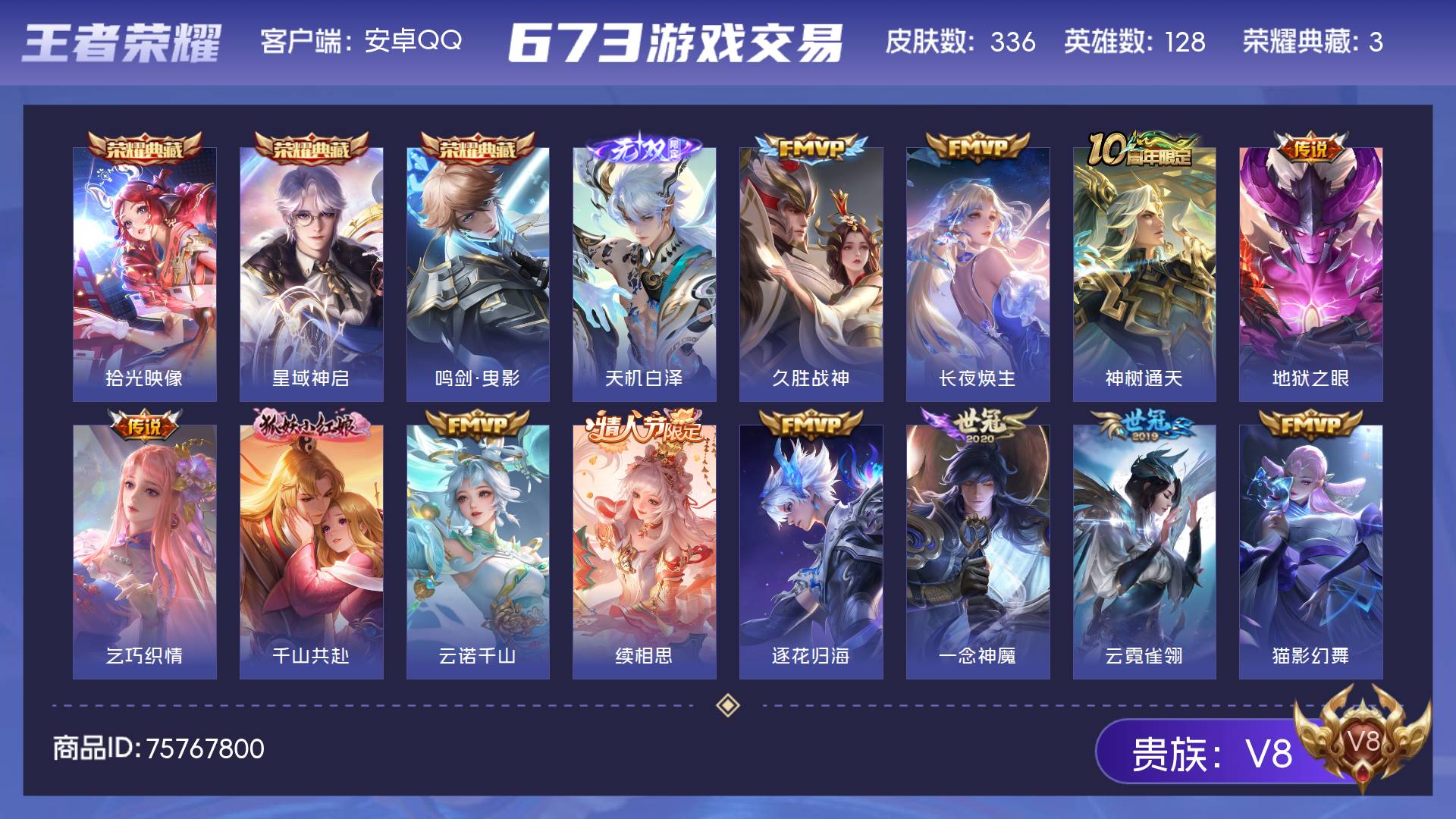V8 皮肤336 英雄128 非凡王者 荣耀典藏3 无双皮肤1 传说20 其他皮肤314