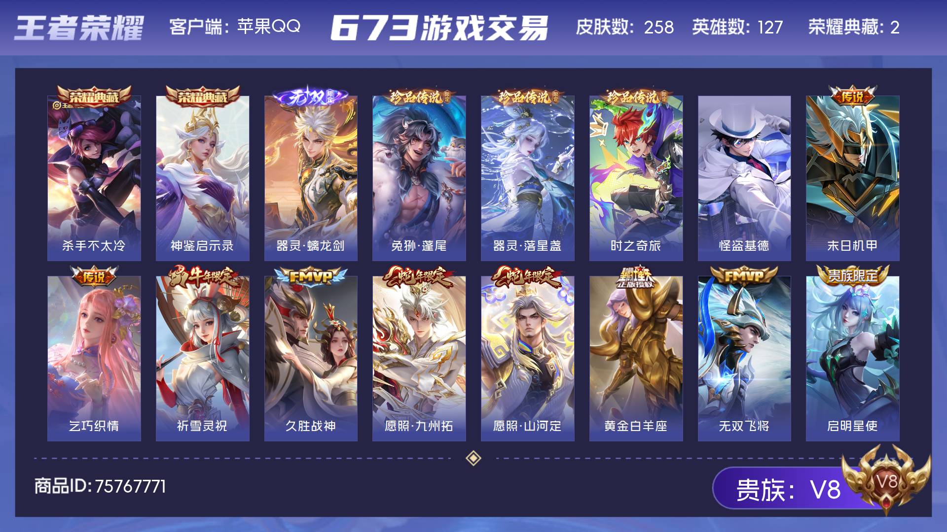 V7 皮肤258 英雄127 至尊星耀 荣耀典藏1 无双皮肤2 珍品传说1 传说8 其他皮肤250