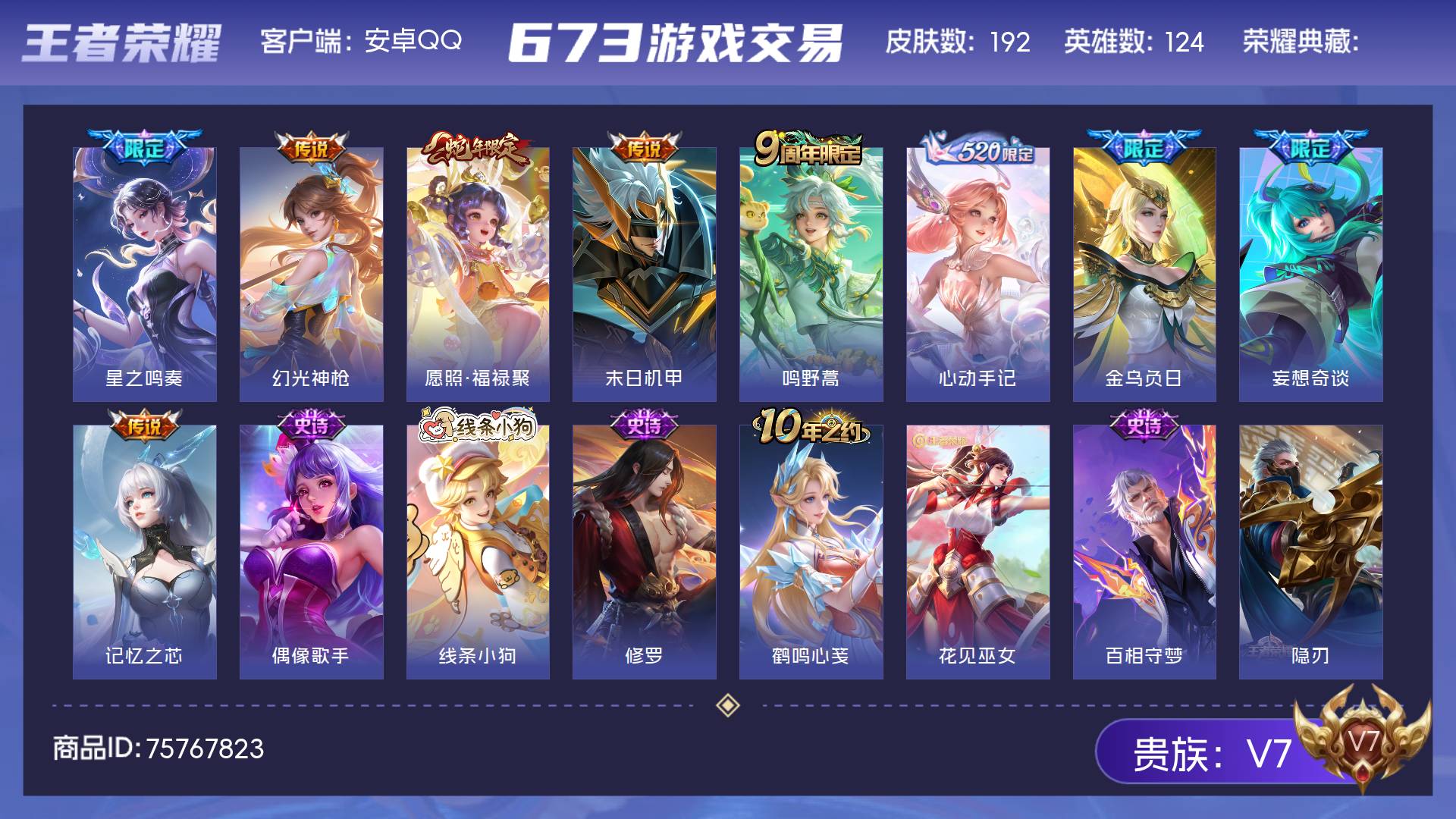 V7 皮肤192 英雄124 永恒钻石 传说9 其他皮肤189