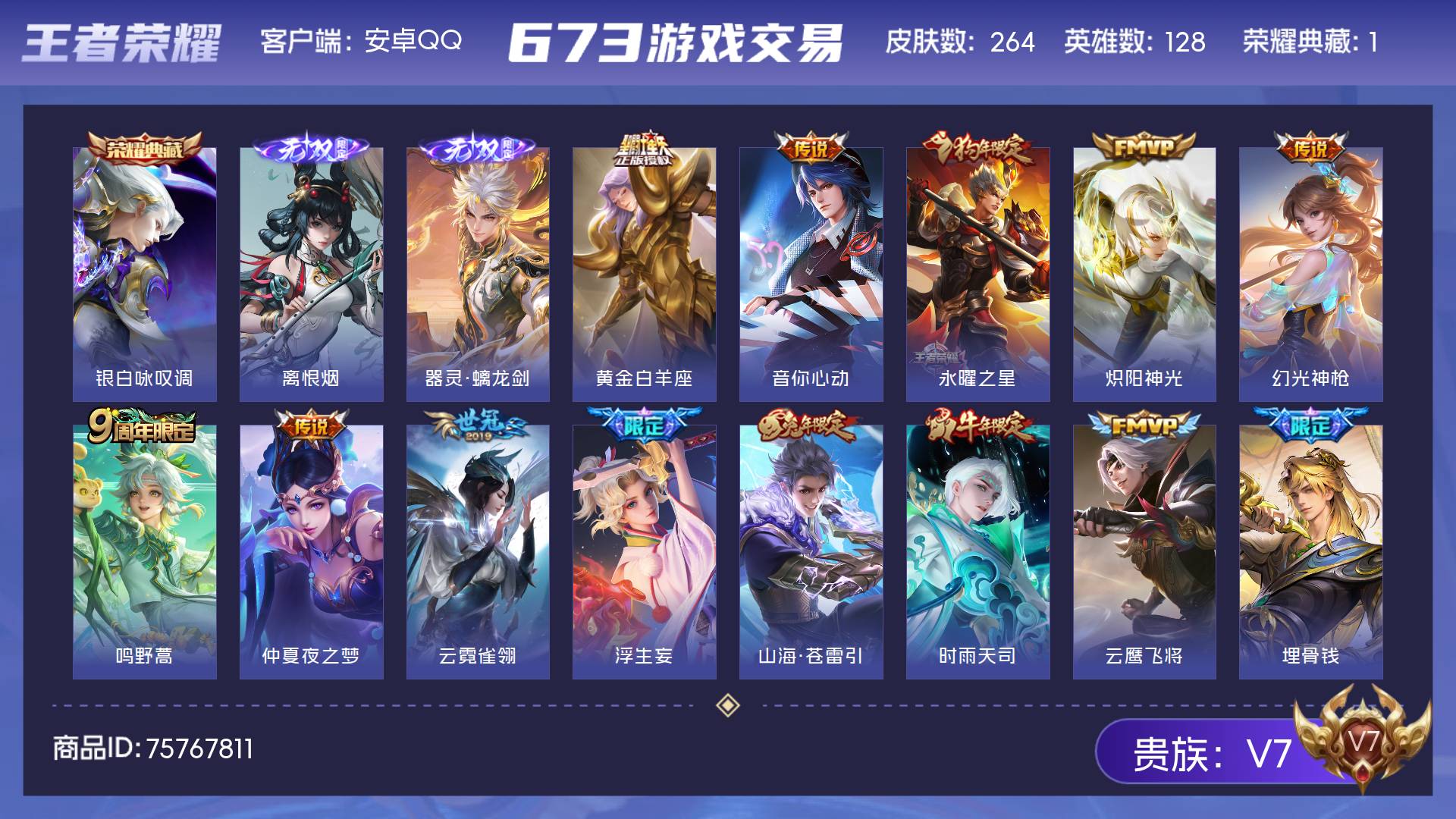 V7 皮肤264 英雄128 最强王者 荣耀典藏1 无双皮肤2 传说13 其他皮肤250