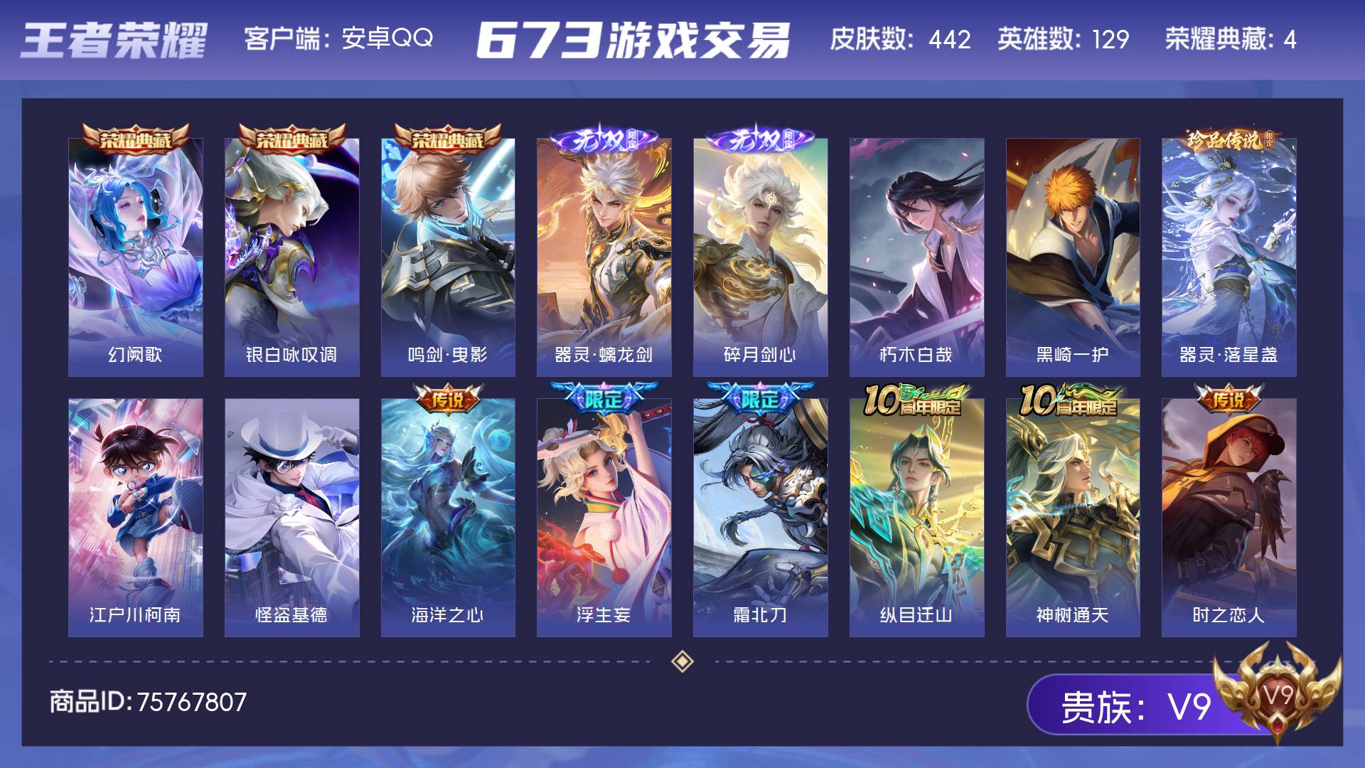 V9 皮肤442 英雄129 最强王者 荣耀典藏4 无双皮肤2 珍品传说5 传说33 其他皮肤399