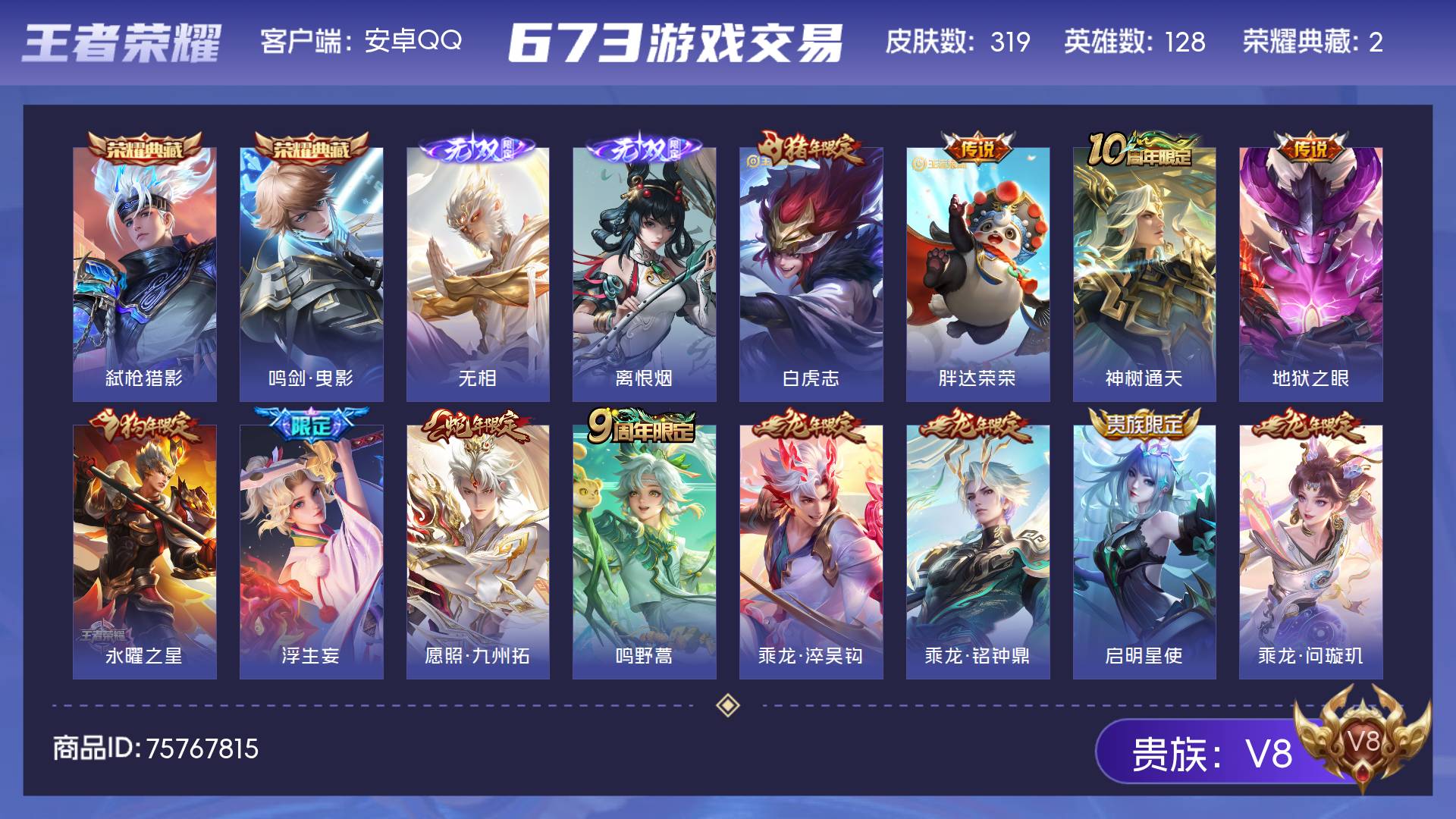 V8 皮肤319 英雄128 非凡王者 荣耀典藏2 无双皮肤2 传说21 其他皮肤297
