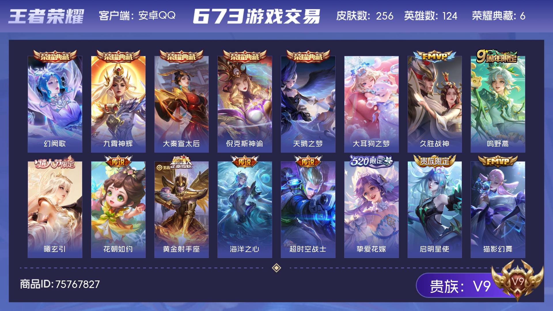 V9 皮肤256 英雄124 永恒钻石 荣耀典藏6 珍品传说1 传说12 其他皮肤243