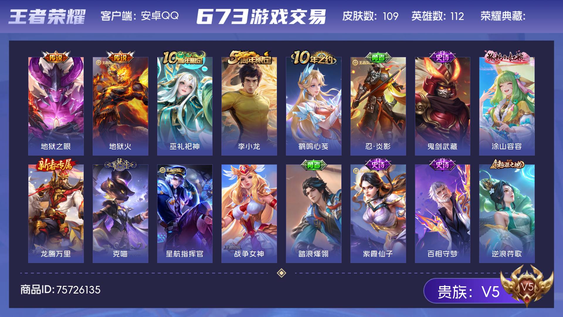 V5 皮肤109 英雄112 至尊星耀 传说2 其他皮肤113