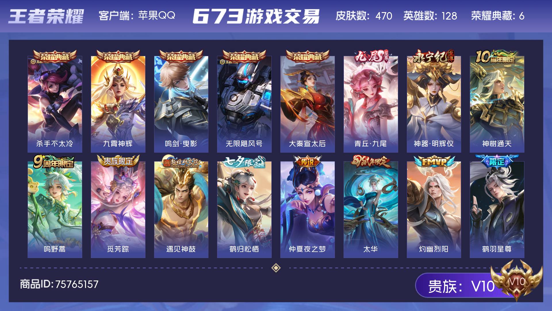 V10 皮肤470 英雄128 永恒钻石 荣耀典藏6 无双皮肤2 传说55 其他皮肤413