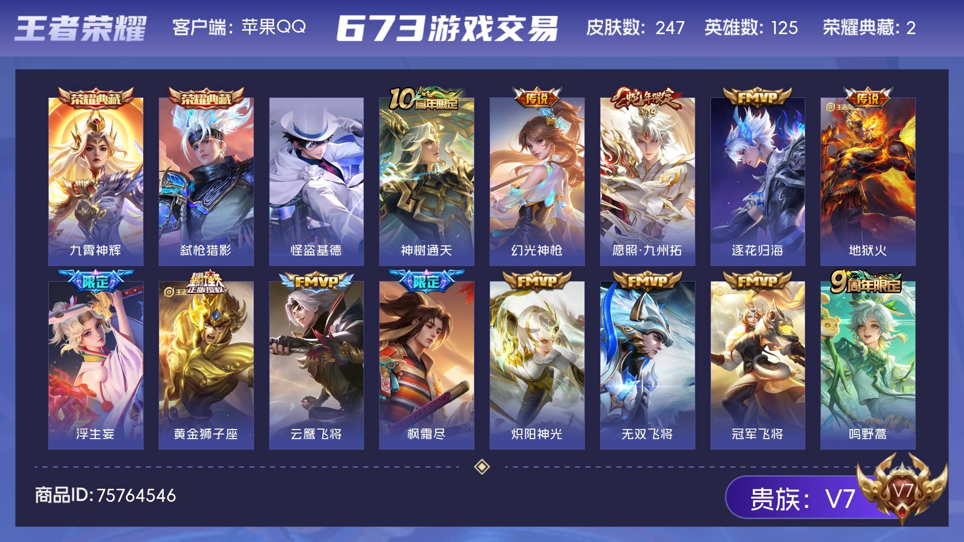 V7 皮肤247 英雄125 永恒钻石 荣耀典藏2 珍品传说1 传说13 其他皮肤237
