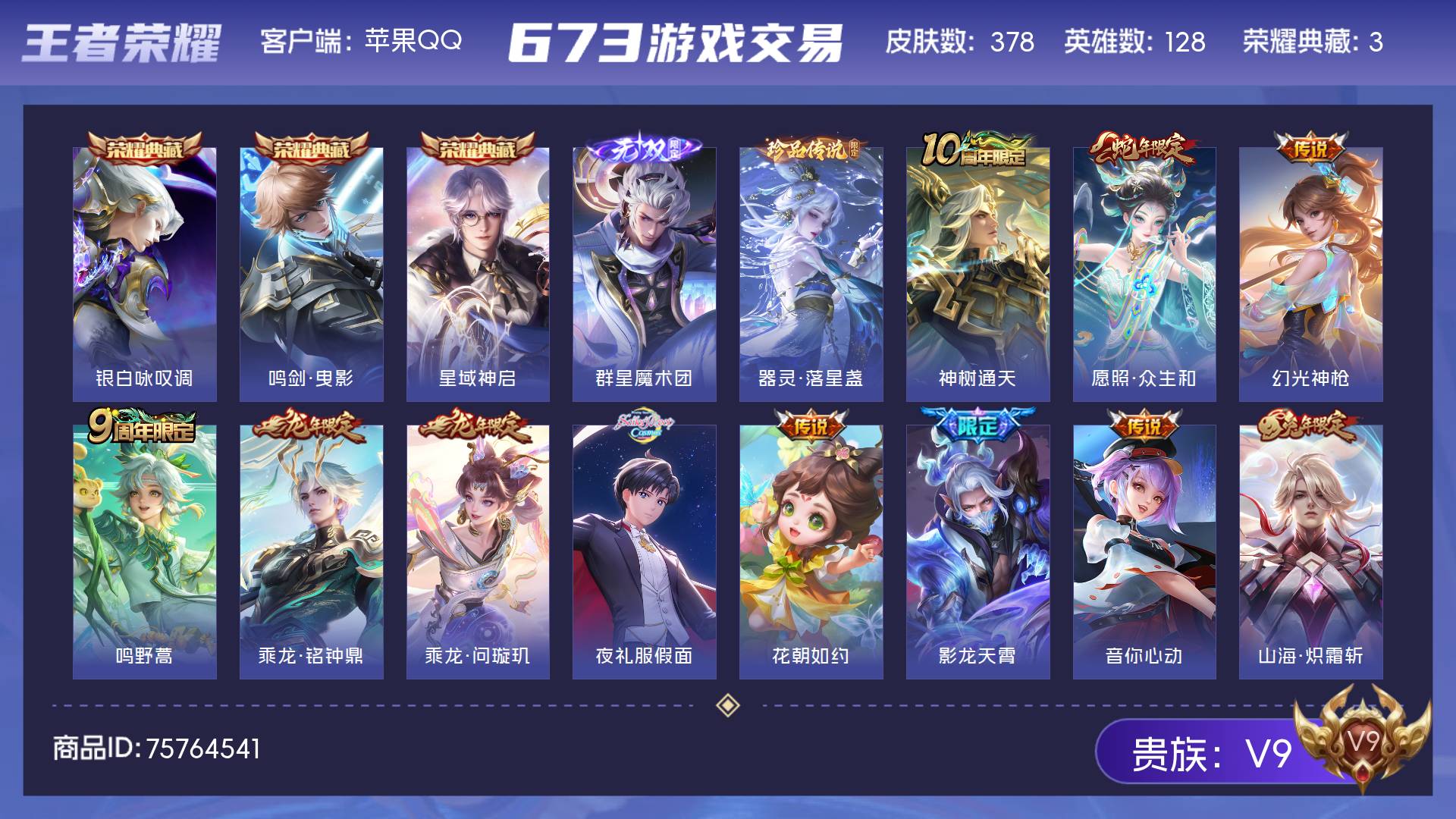 V9 皮肤378 英雄128 荣耀黄金 荣耀典藏3 无双皮肤1 珍品传说1 传说29 其他皮肤349