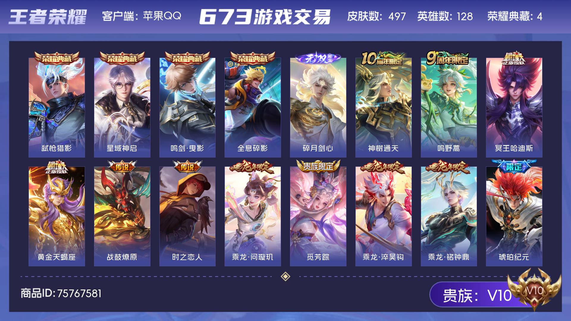 V10 皮肤497 英雄128 最强王者 荣耀典藏4 无双皮肤1 传说52 其他皮肤445
