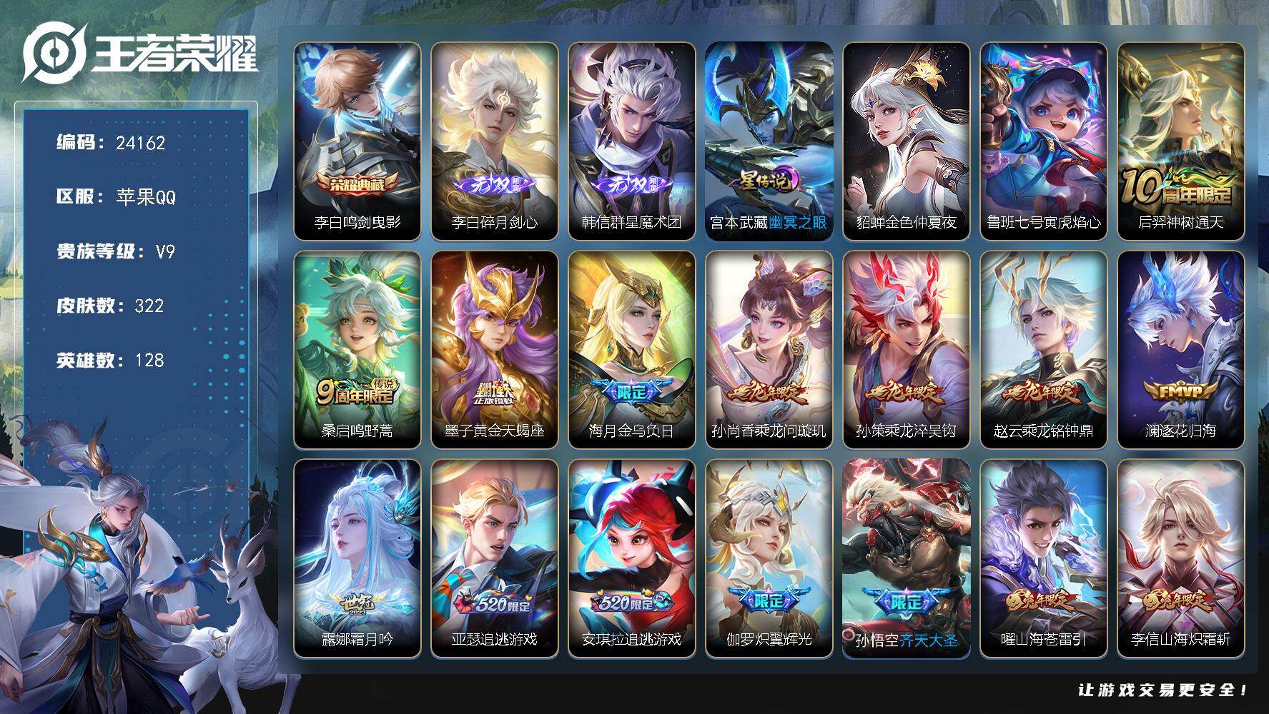 可换绑【顶级V9捡漏号·李白韩信无双·李白典藏·黄金天蝎座·李逍遥·龙年全套·