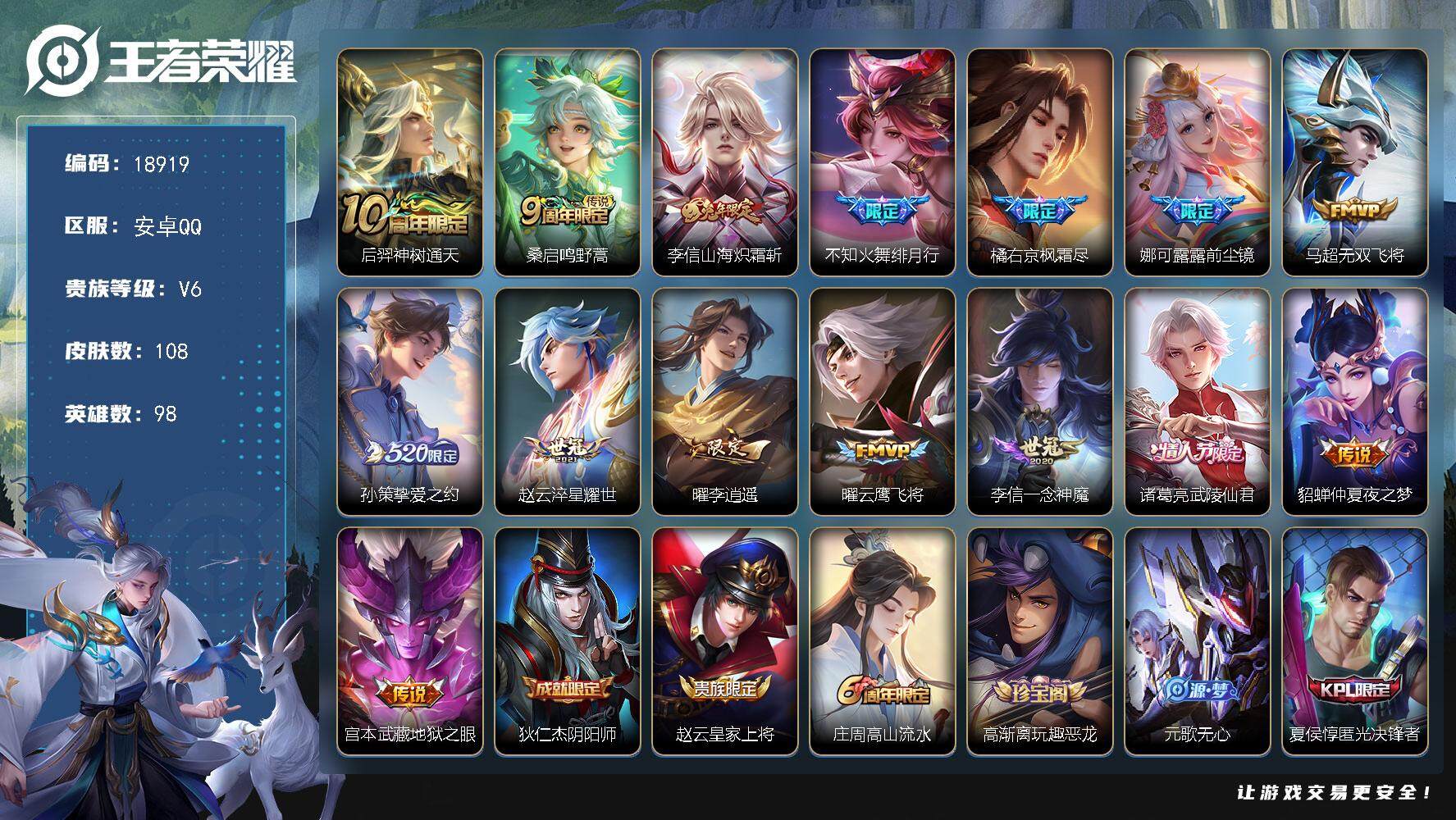 可换绑【V10精品号 妲己全皮 王昭君全皮 5典藏 2无双 多传说限定质量号】