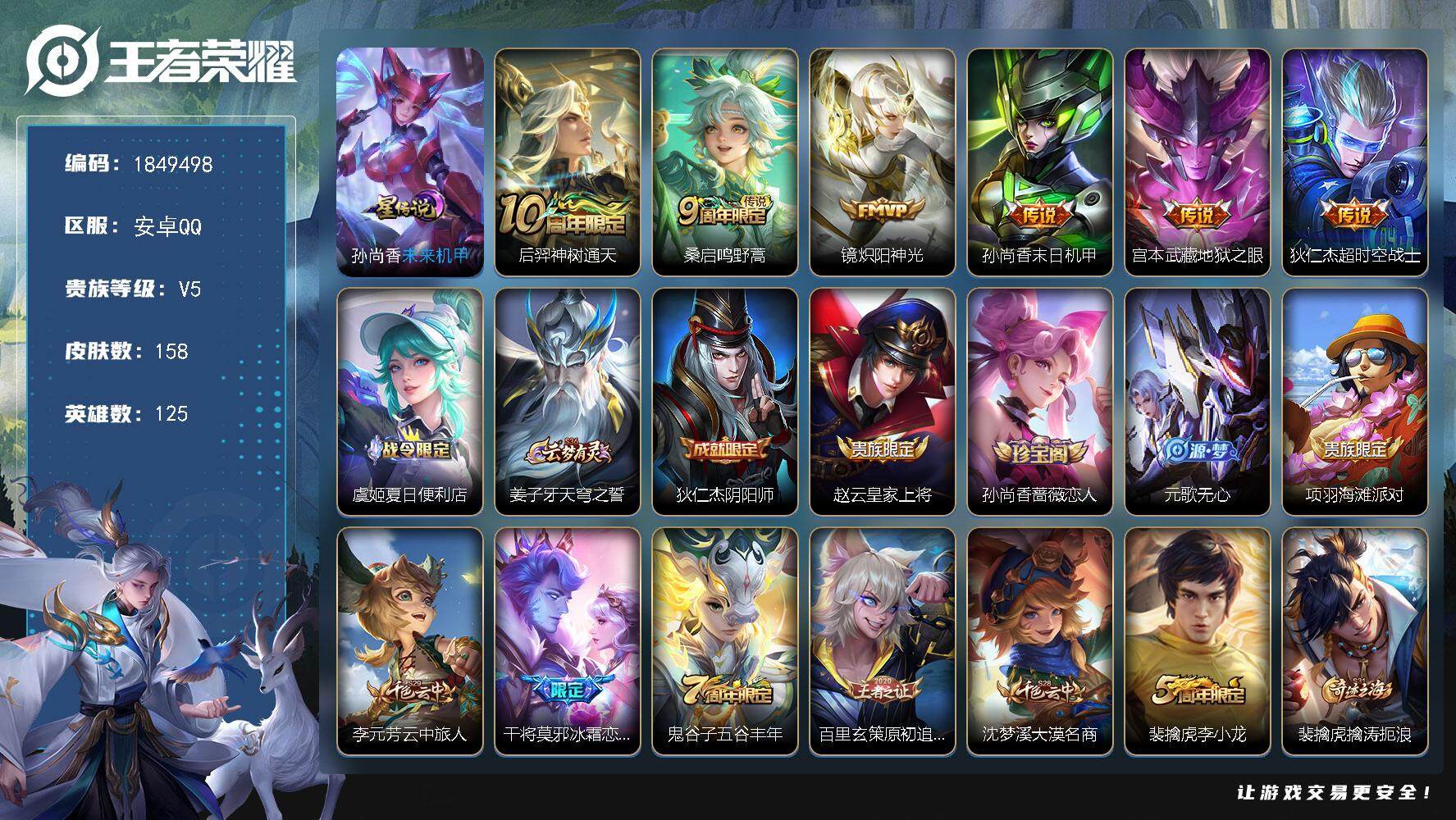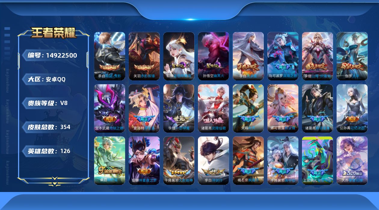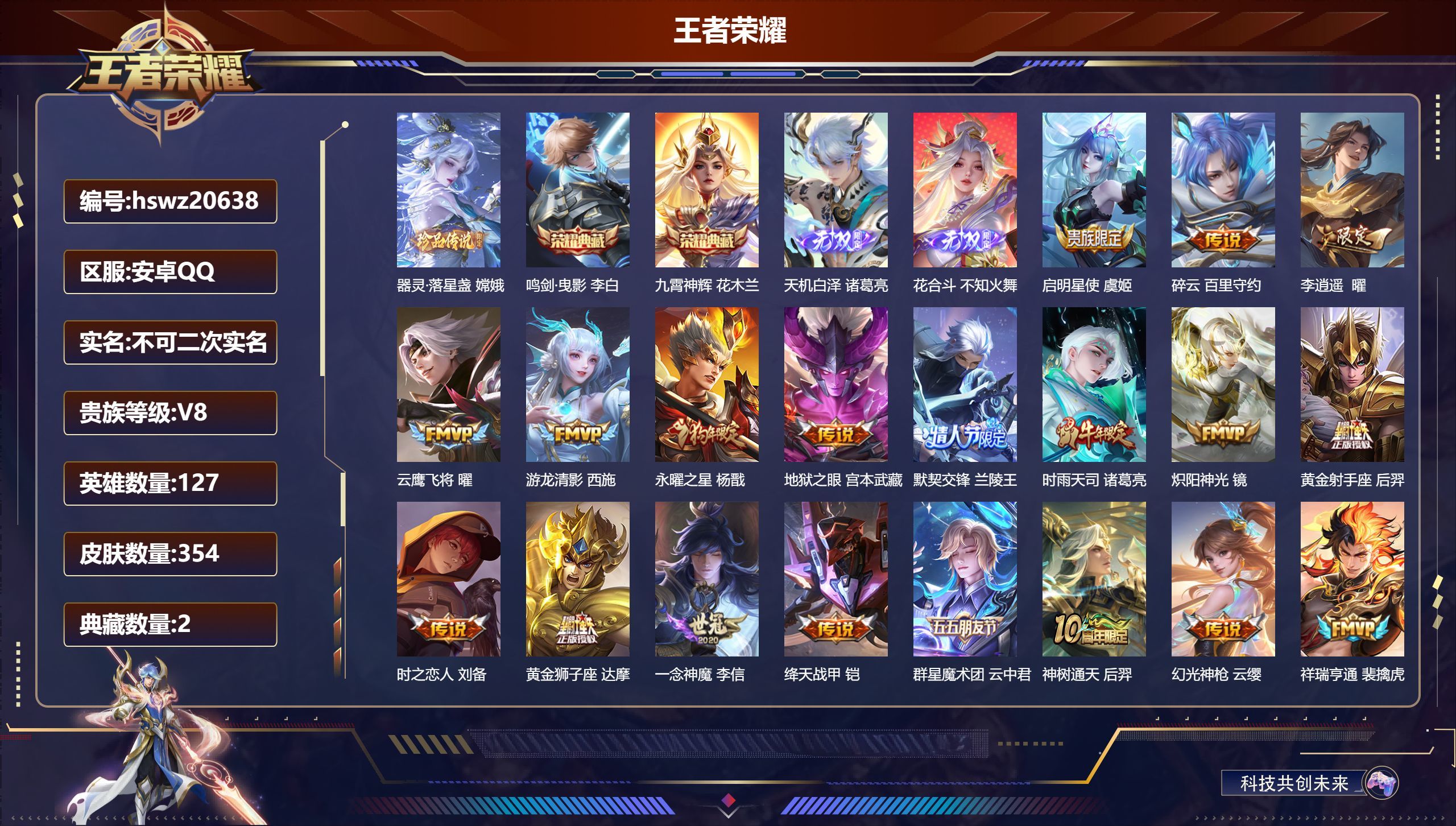 安卓QQ/至圣王者/354皮肤/127英雄/2典藏/0珍品无双/2无双/1珍品传说/22传说/118