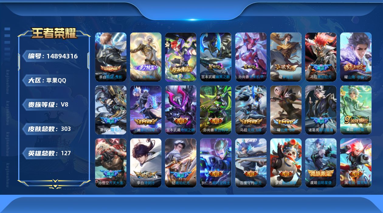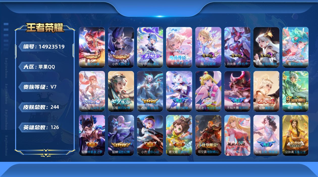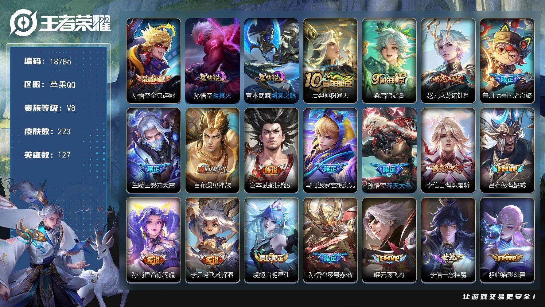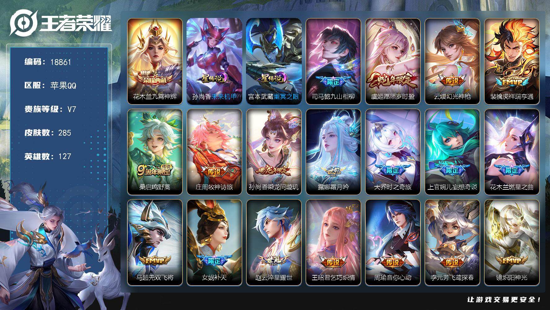 苹果QQ 皮肤220 英雄125 典藏1 无双2 珍品传说1 传说7 其他皮肤56 无双王者-【220皮1典藏2无双1典藏1珍品7传说,器灵螭龙剑,神罪,愿照九州拓,愿照岁