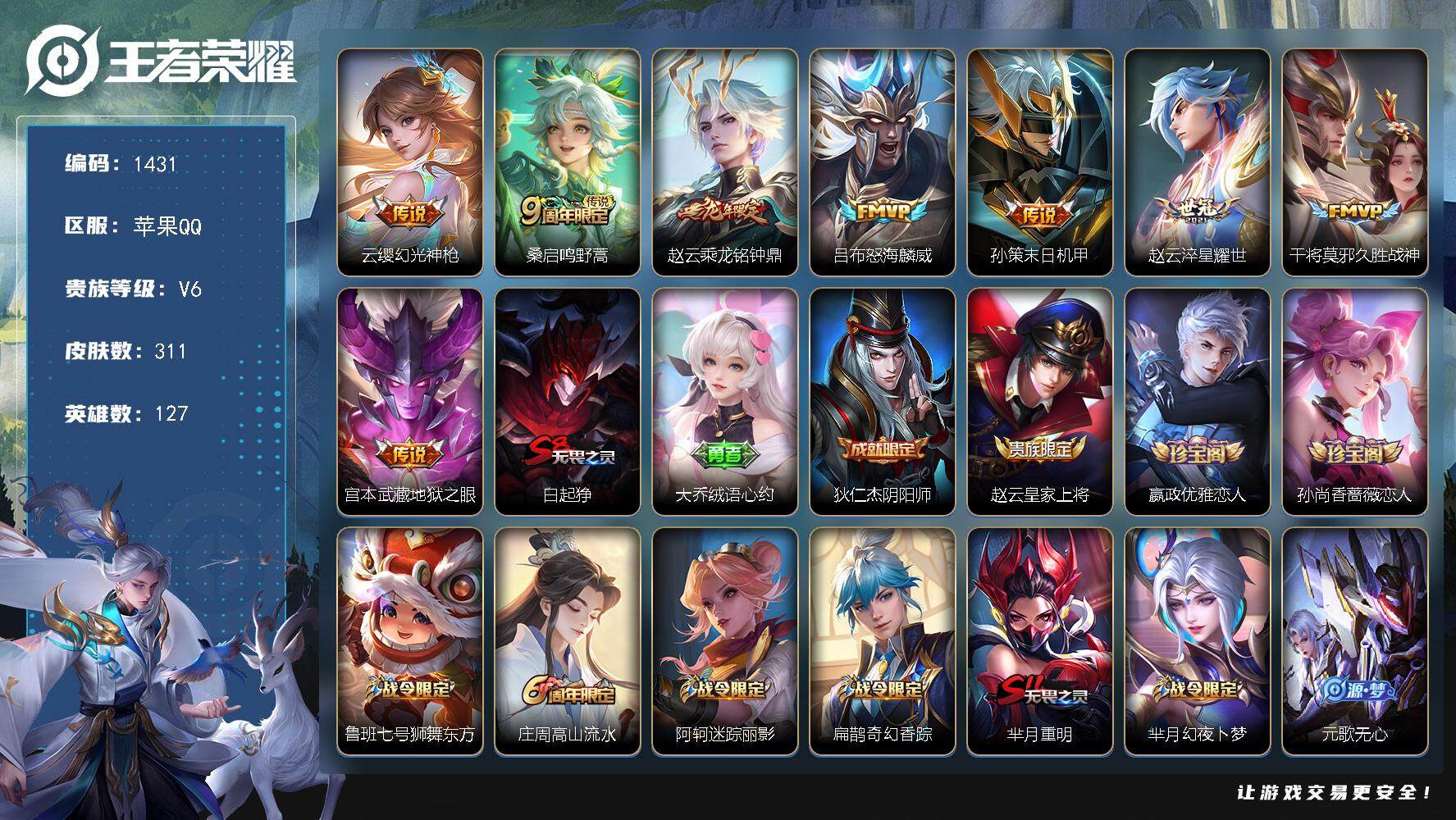 苹果QQ 皮肤311 英雄127 传说8 其他皮肤114 非凡王者-【311皮8传说乘龙铭钟鼎 怒海麟威 末日机甲 久胜战神 】苹果Q-V6-最强