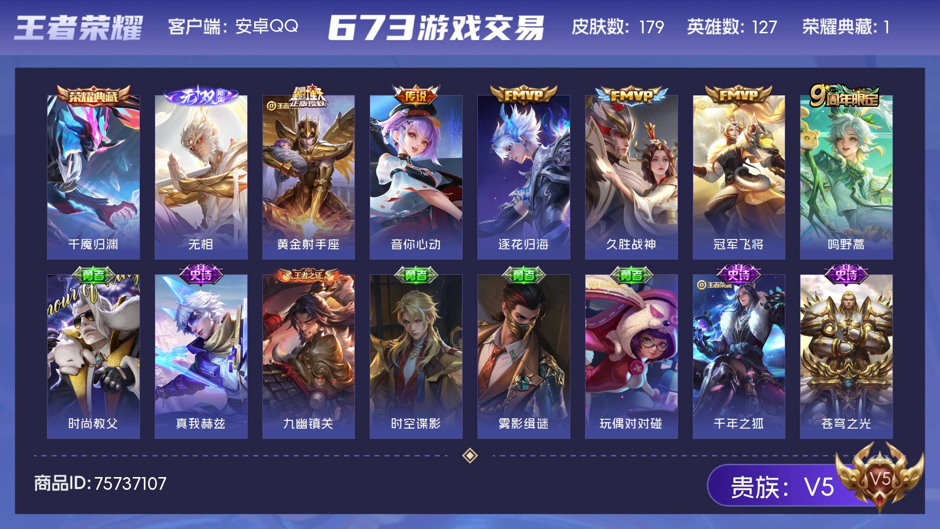V5 皮肤179 英雄127 非凡王者 荣耀典藏1 无双皮肤1 传说6 其他皮肤177