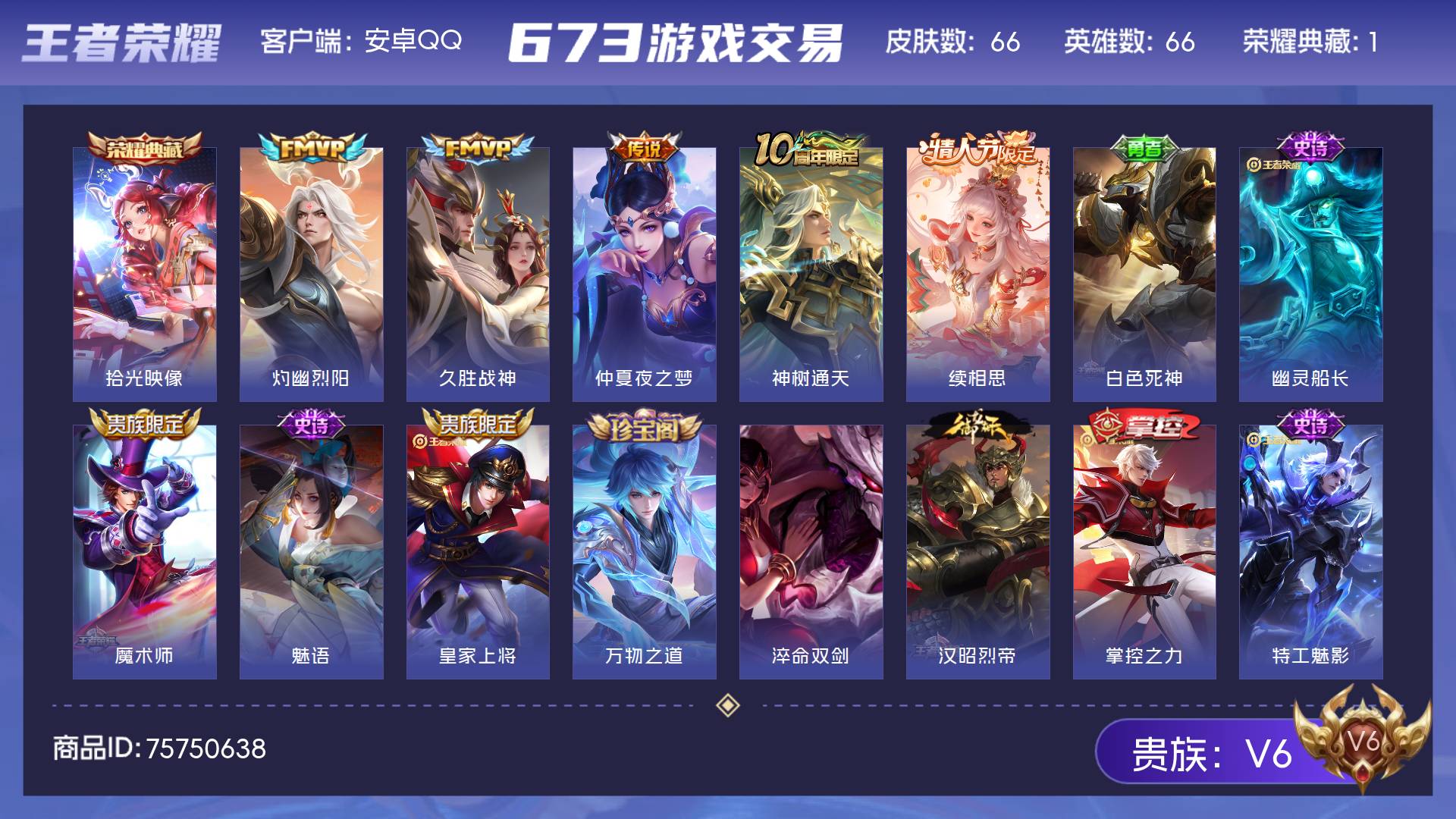 V6 皮肤66 英雄66 永恒钻石 荣耀典藏1 传说5 其他皮肤59