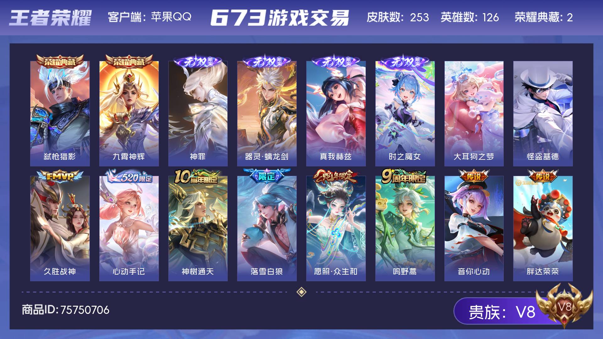 V8 皮肤253 英雄126 永恒钻石 荣耀典藏2 无双皮肤4 珍品传说2 传说17 其他皮肤234