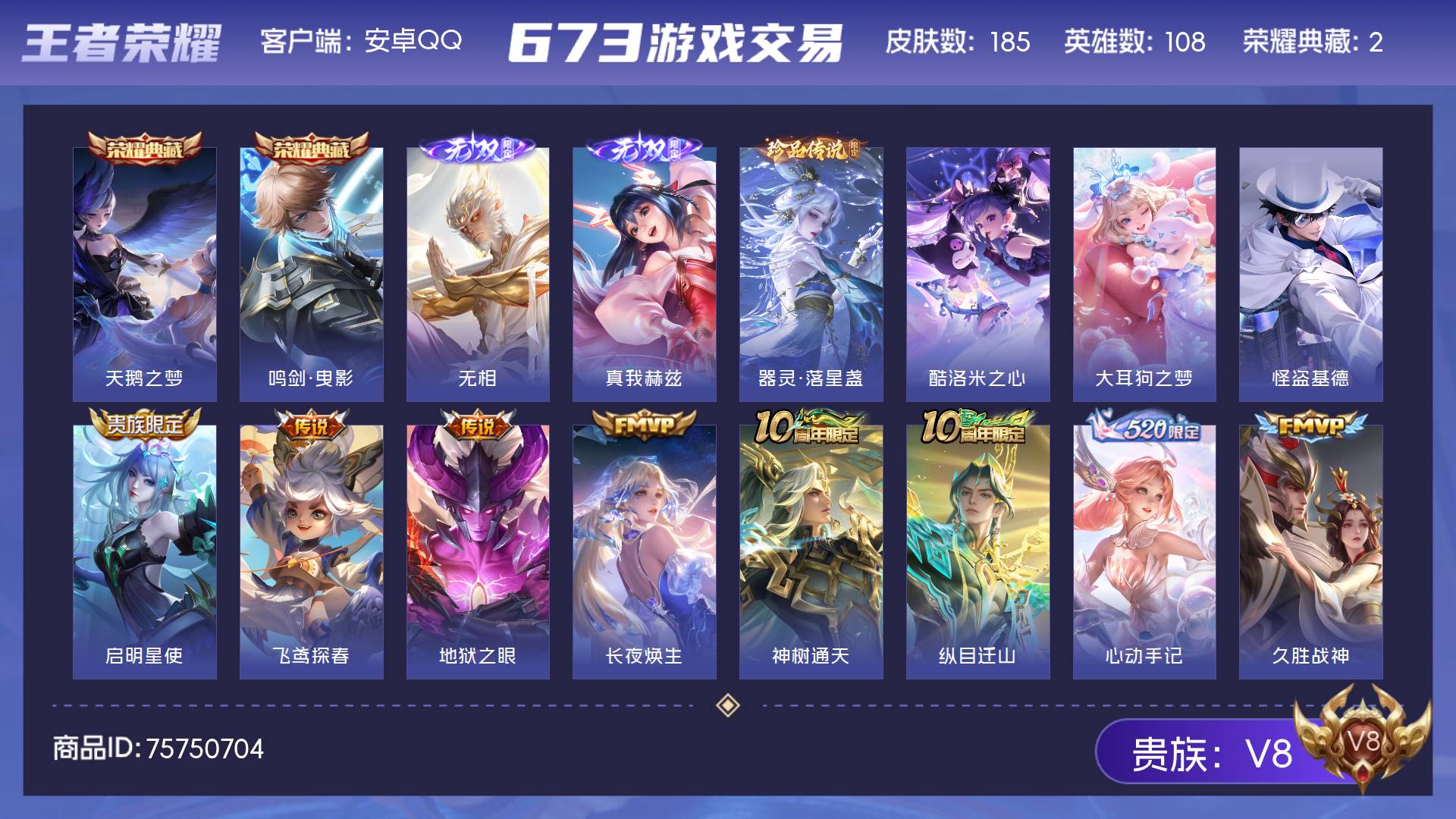 V8 皮肤185 英雄108 至尊星耀 荣耀典藏2 无双皮肤2 珍品传说4 传说18 其他皮肤156