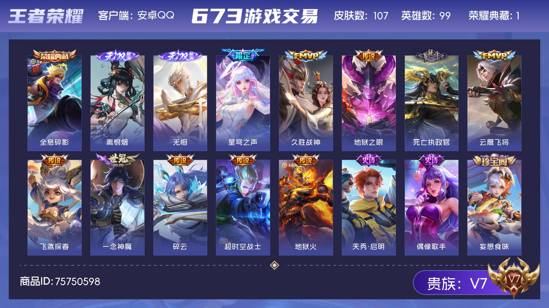 V7 皮肤107 英雄99 无双王者 荣耀典藏1 无双皮肤2 星传说1 传说10 其他皮肤98