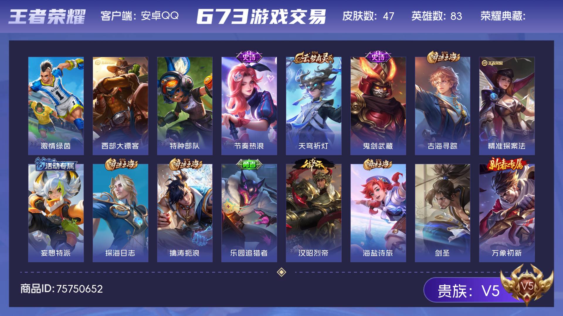 V5 皮肤47 英雄83 荣耀黄金 其他皮肤53