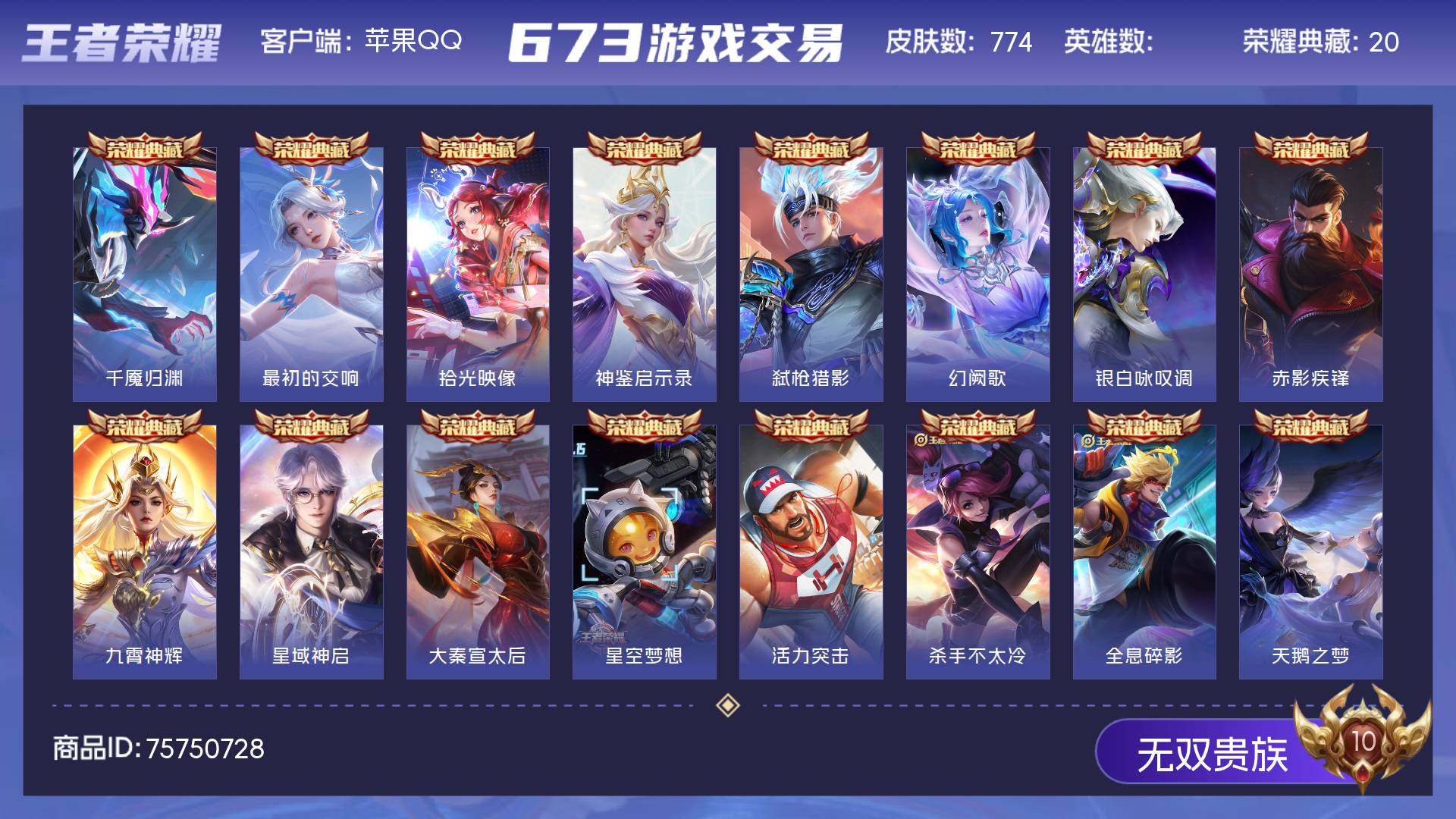 无双贵族 皮肤774 荣耀王者 荣耀典藏20 珍品无双1 无双皮肤12 珍品传说9 星传说15 传说131 其他皮肤589