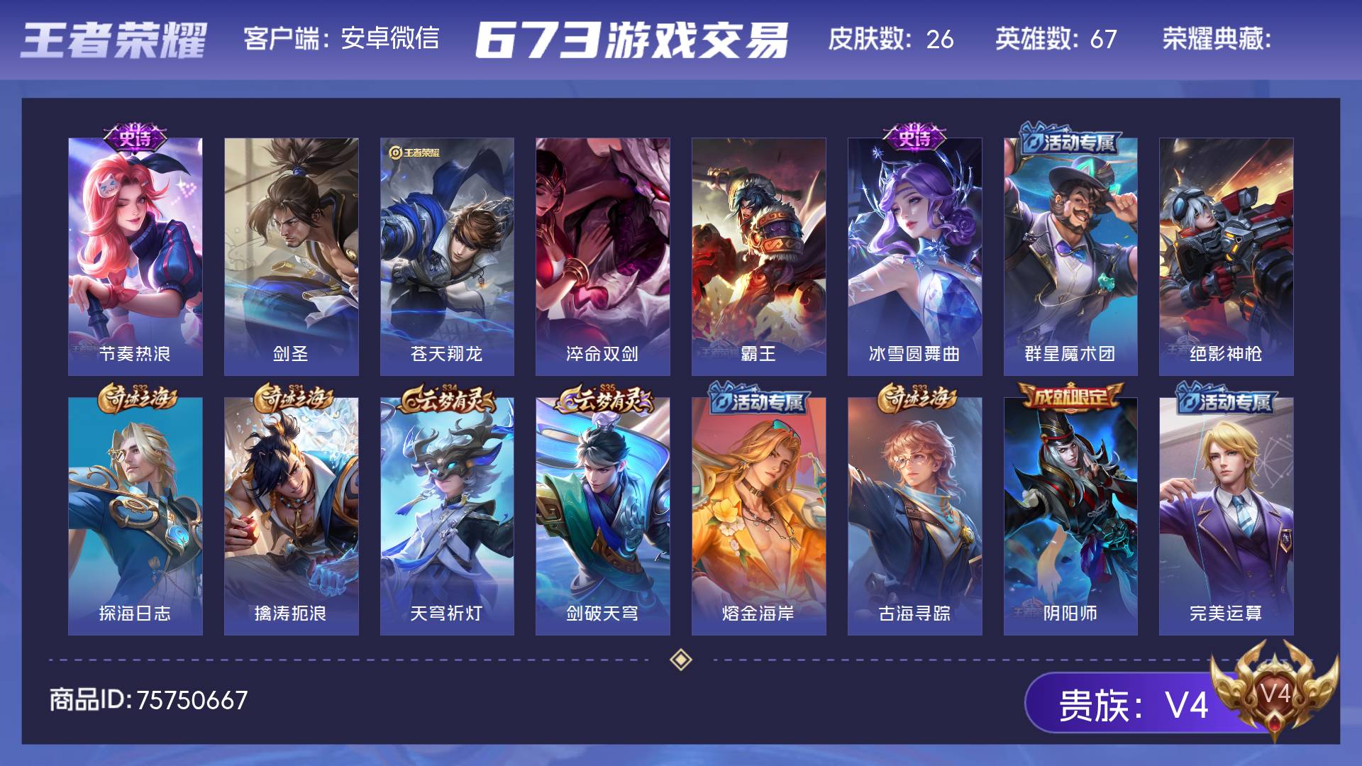 V4 皮肤26 英雄67 至尊星耀 星传说1 其他皮肤31
