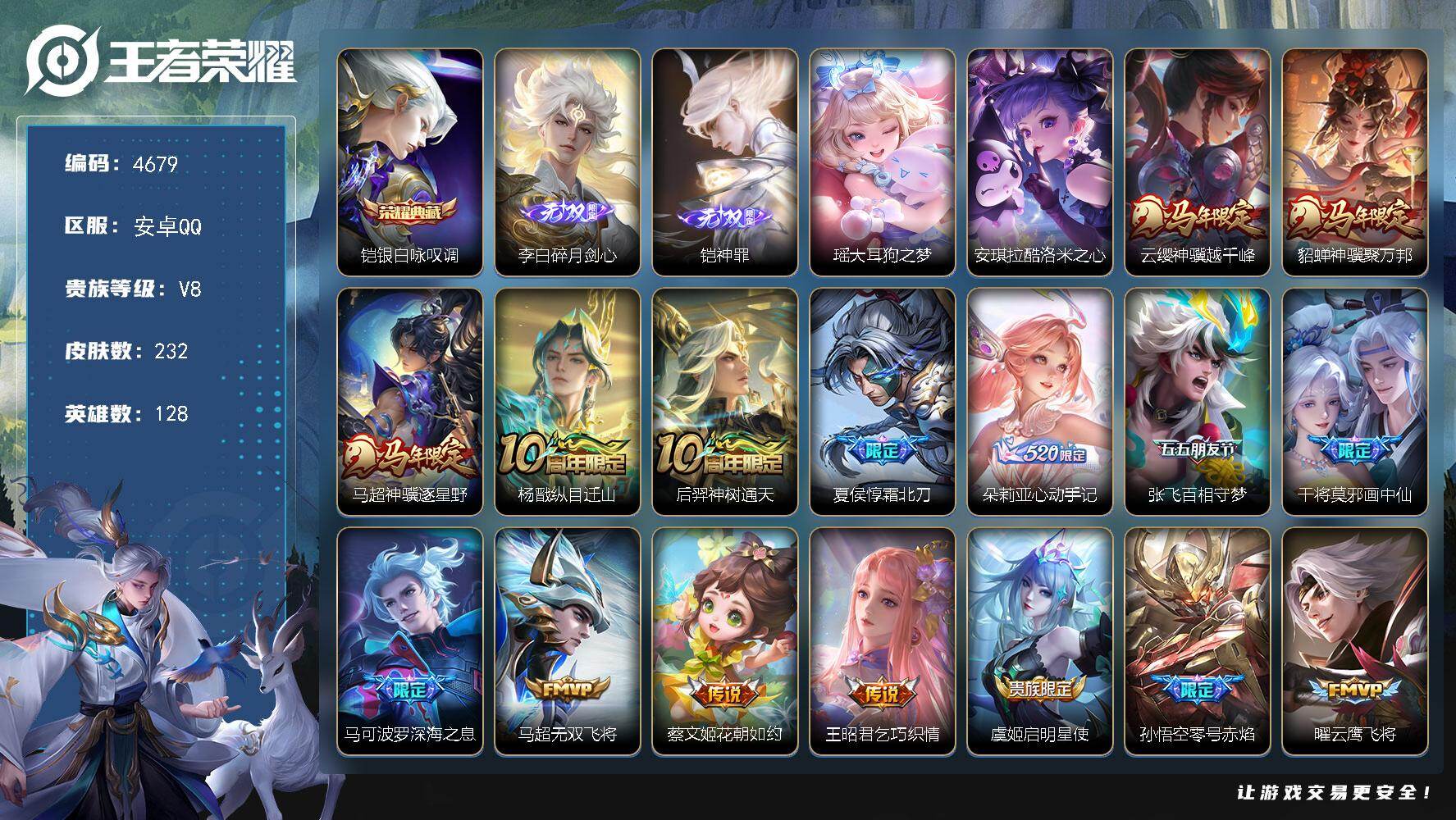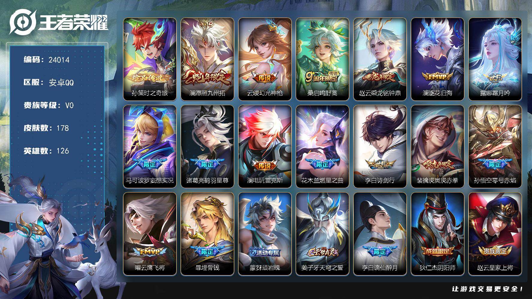 安卓QQ/V6/至圣王者/241皮肤/126英雄/1典藏/0珍品无双/0无双/