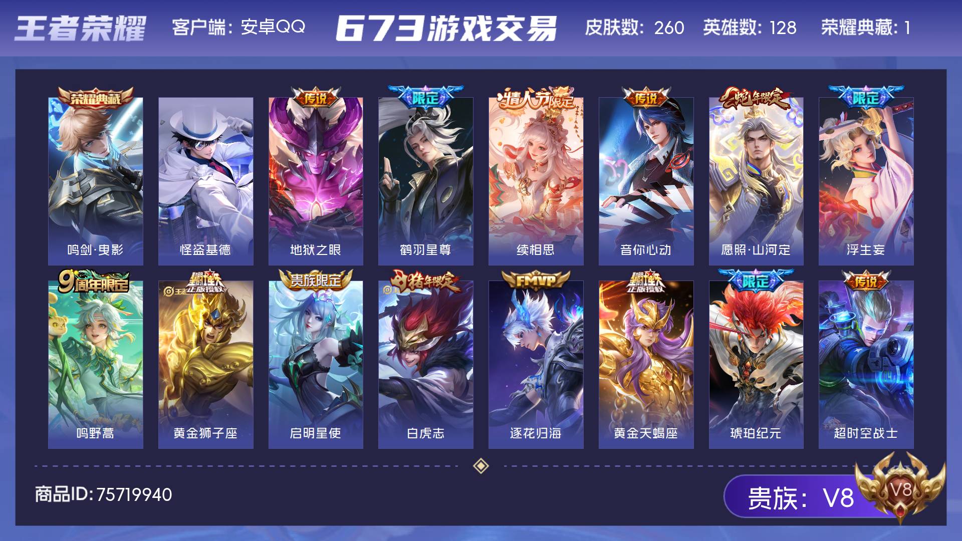 V8 皮肤260 英雄128 至尊星耀 荣耀典藏1 珍品传说1 传说22 其他皮肤241