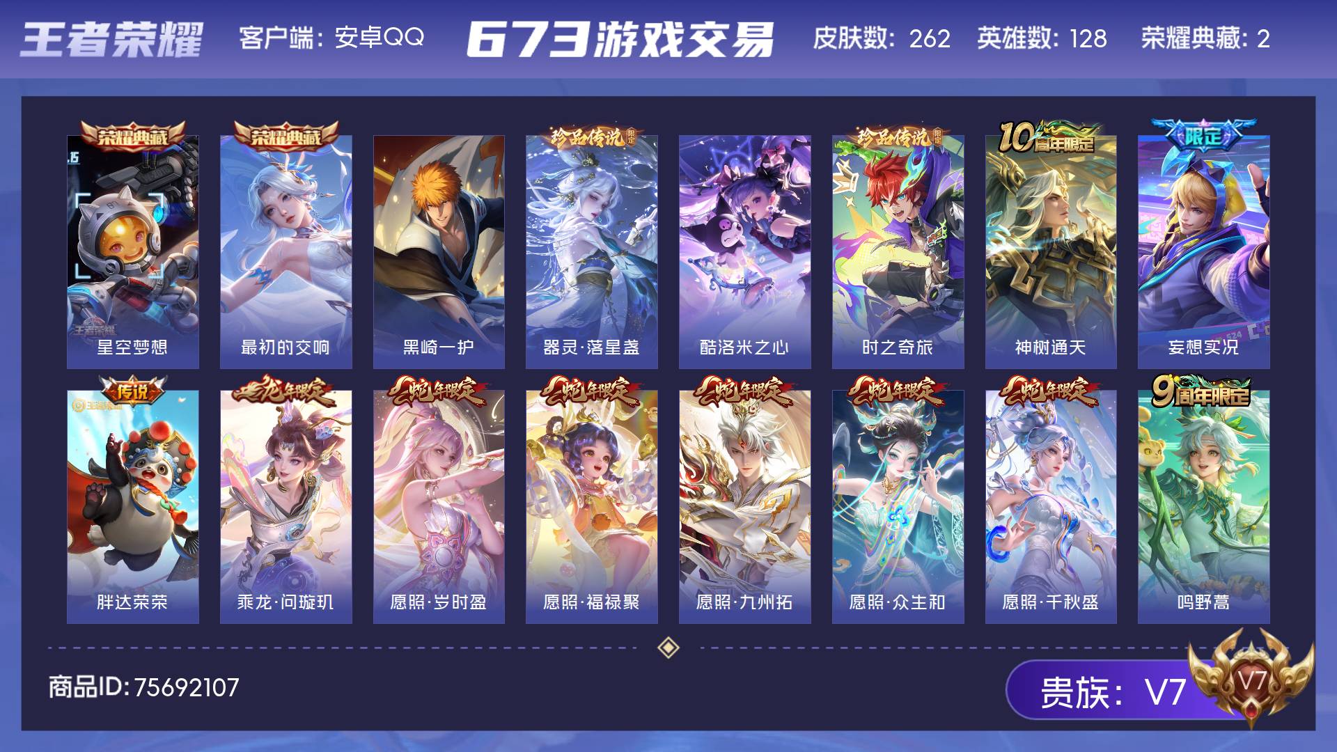 V7 皮肤262 英雄128 非凡王者 荣耀典藏2 珍品传说4 传说14 其他皮肤247