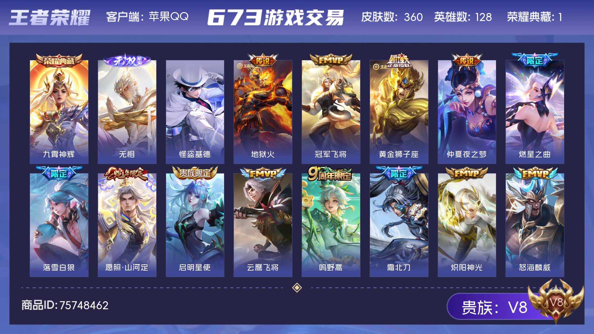 V8 皮肤360 英雄128 至尊星耀 荣耀典藏1 无双皮肤1 珍品传说1 传说19 其他皮肤339