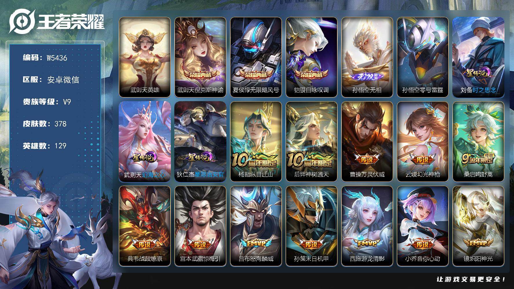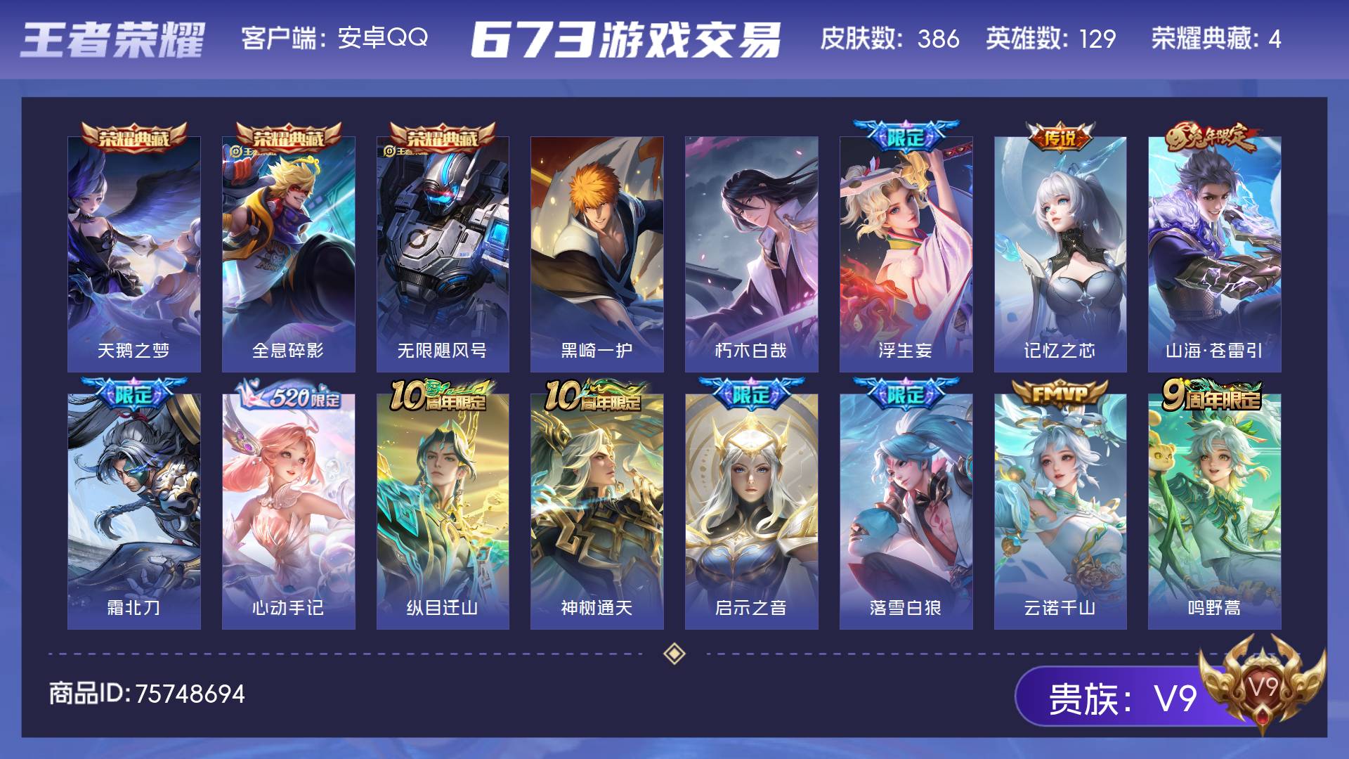 V9 皮肤386 英雄129 非凡王者 荣耀典藏4 珍品传说2 传说33 其他皮肤353