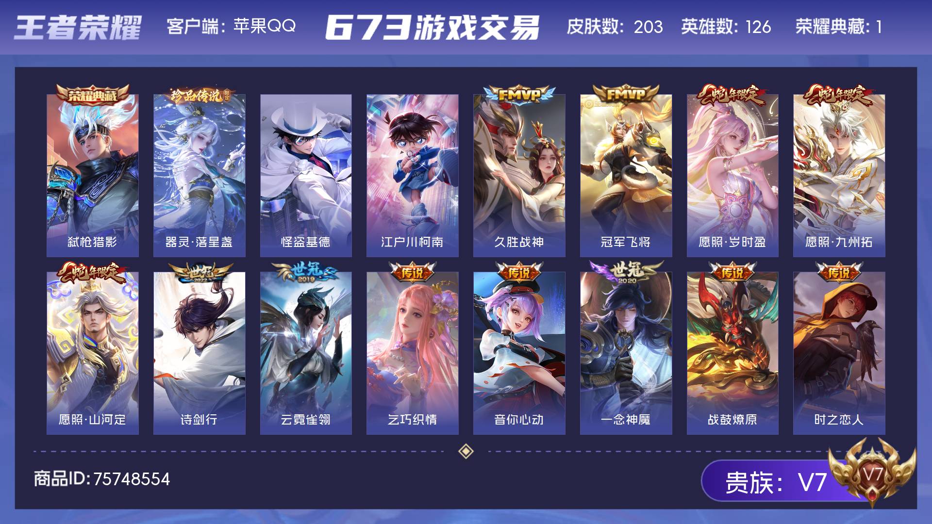 V7 皮肤203 英雄126 永恒钻石 荣耀典藏1 珍品传说3 传说12 其他皮肤193
