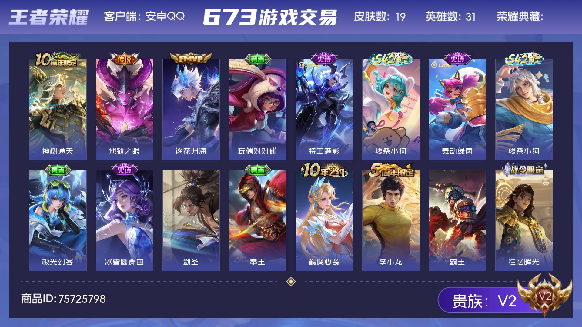 V2 皮肤19 英雄31 至尊星耀 星传说1 传说3 其他皮肤19
