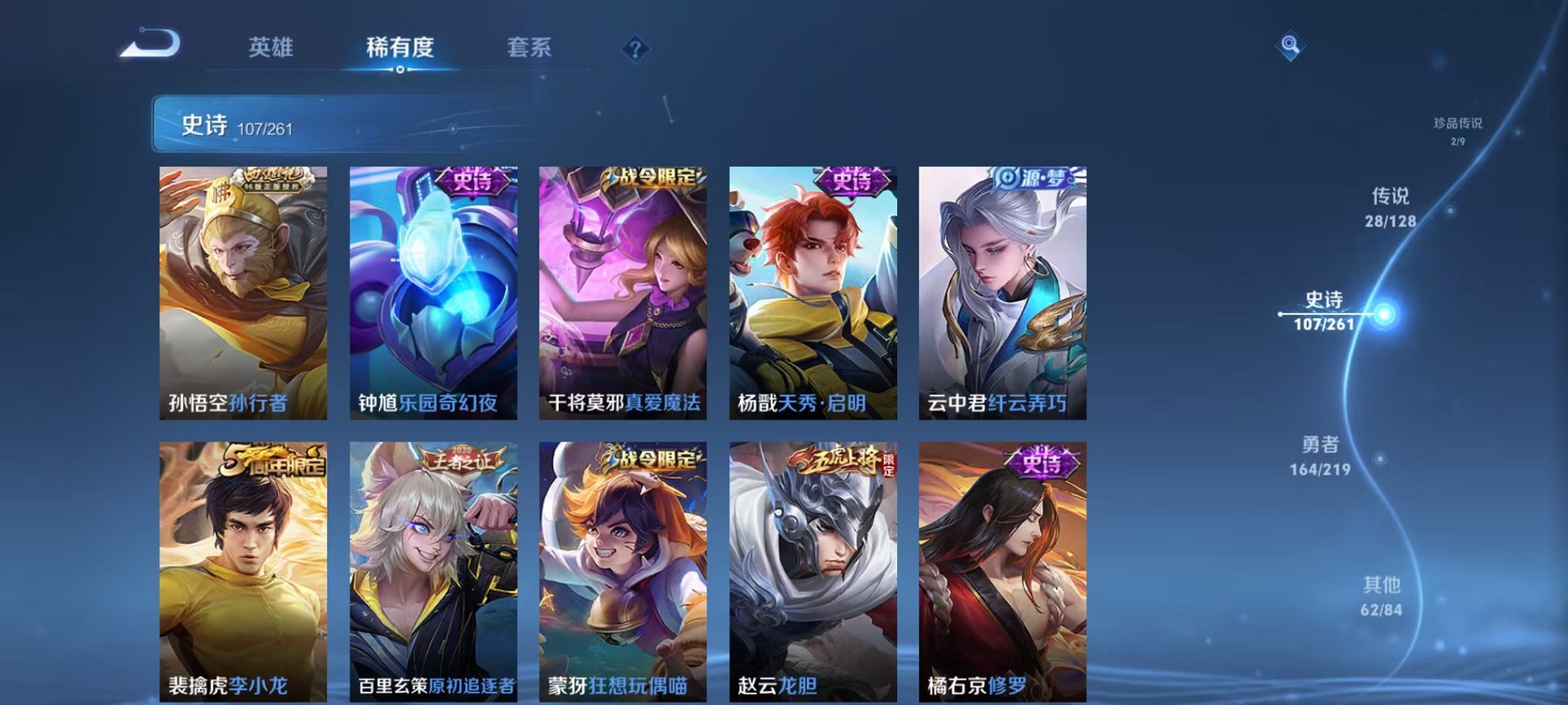 V8 皮肤263 英雄127 至尊星耀 荣耀典藏1 无双皮肤1 珍品传说1 传说16 其他皮肤249