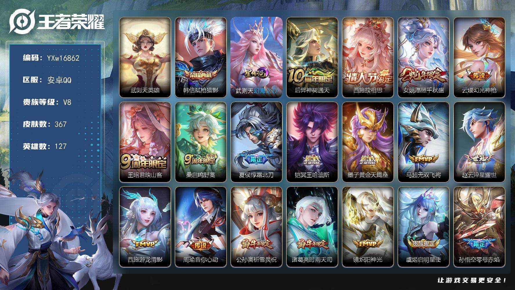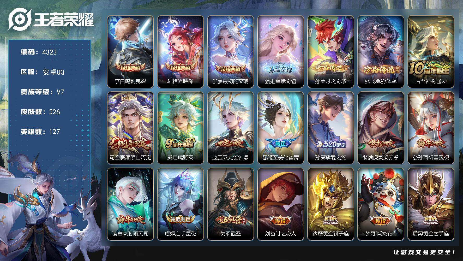 V9 皮肤329 英雄128 至圣王者 荣耀典藏2 珍品传说1 星传说3 传说28 其他皮肤300