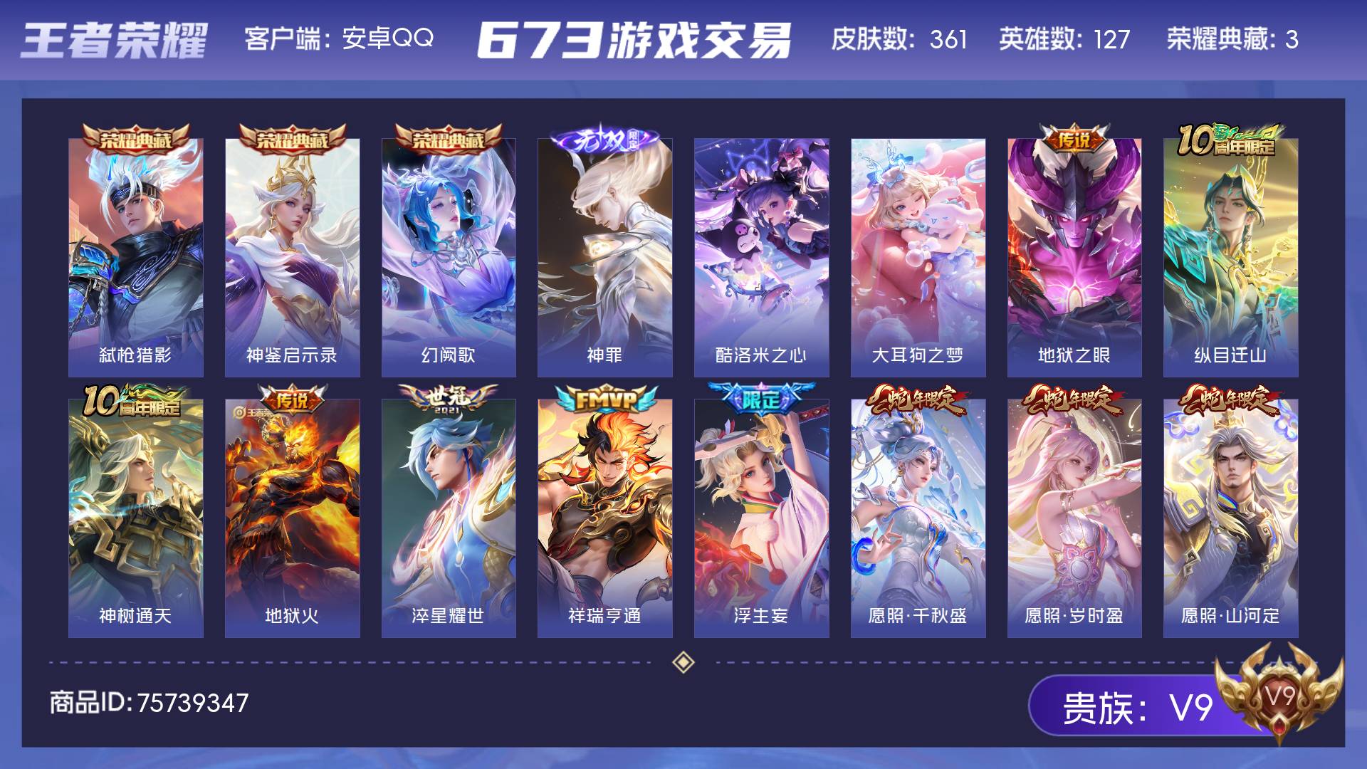 V9 皮肤361 英雄127 尊贵铂金 荣耀典藏3 无双皮肤1 珍品传说2 传说29 其他皮肤331