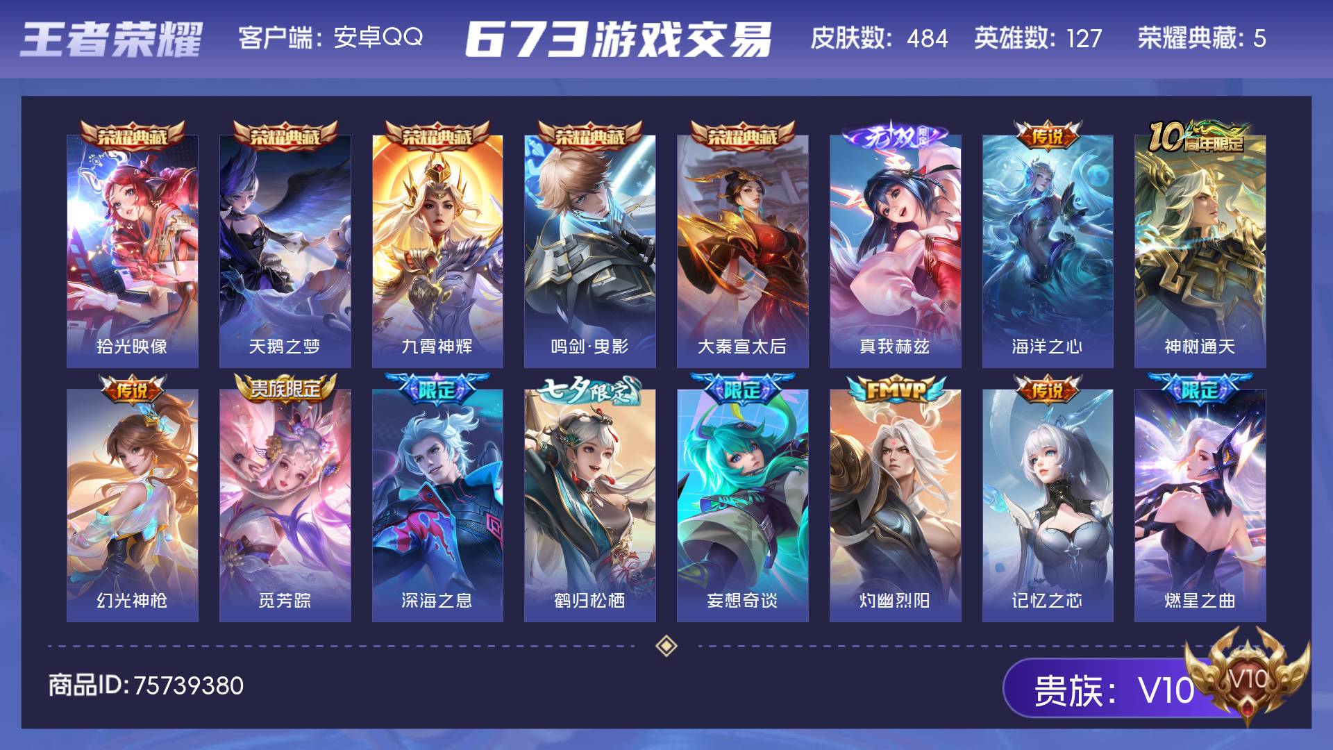 V10 皮肤484 英雄127 最强王者 荣耀典藏5 无双皮肤1 传说57 其他皮肤425