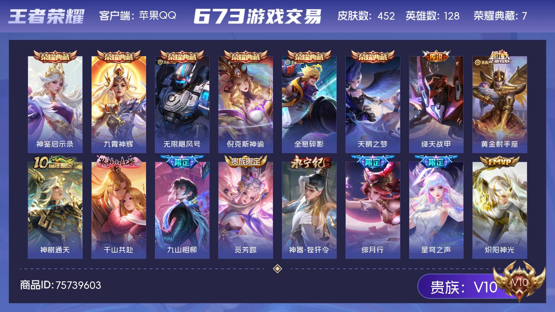 V10 皮肤452 英雄128 至圣王者 荣耀典藏7 传说49 其他皮肤397