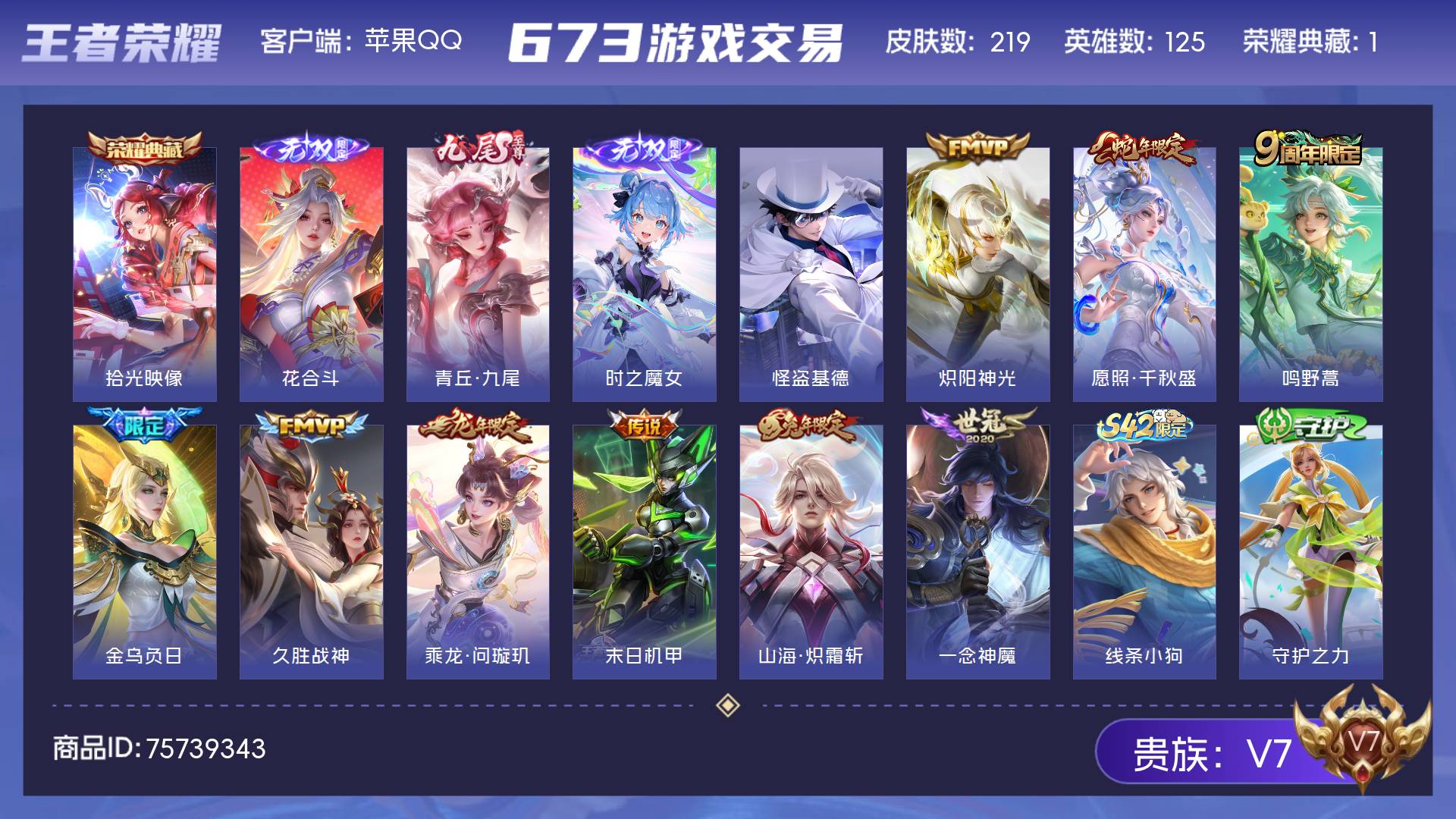 V7 皮肤219 英雄125 尊贵铂金 荣耀典藏1 无双皮肤3 珍品传说1 传说9 其他皮肤211