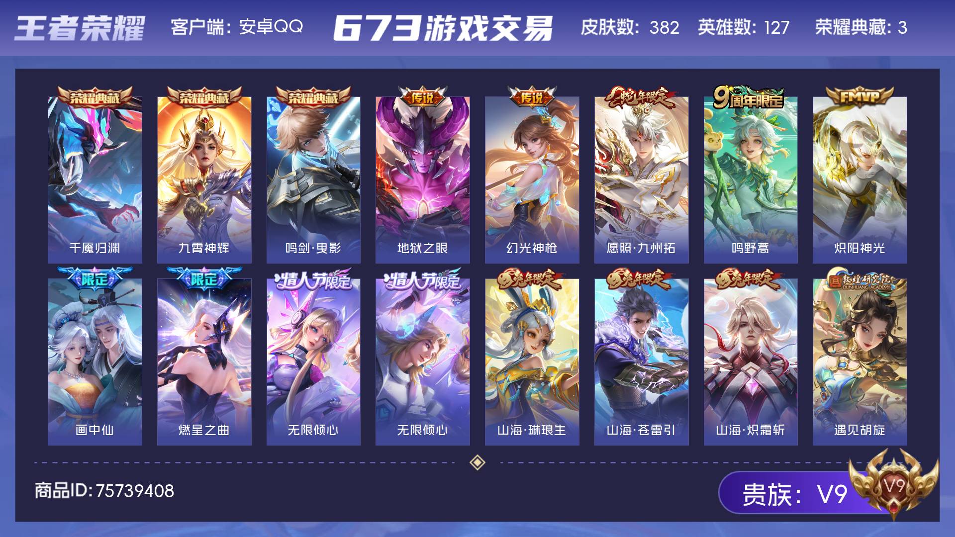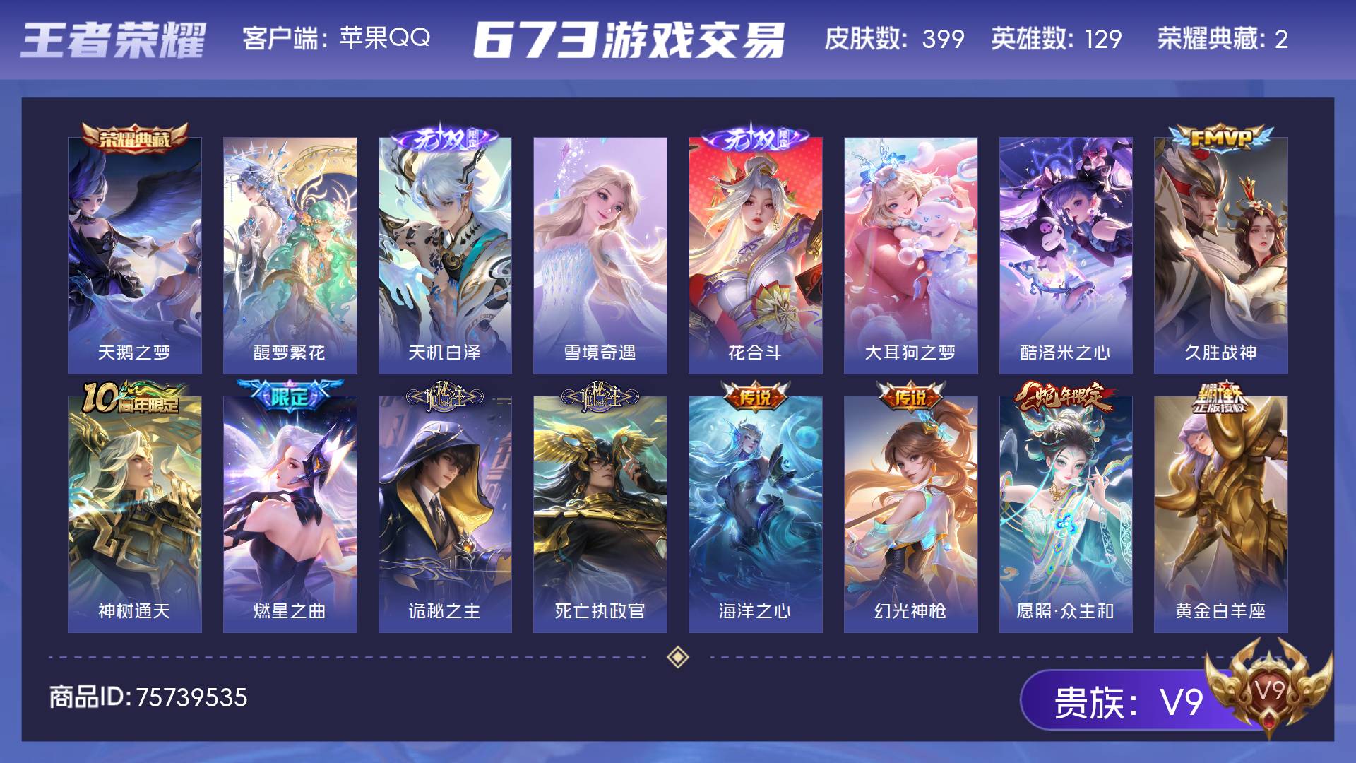 V9 皮肤399 英雄129 最强王者 荣耀典藏2 珍品无双1 无双皮肤3 珍品传说2 传说27 其他皮肤363