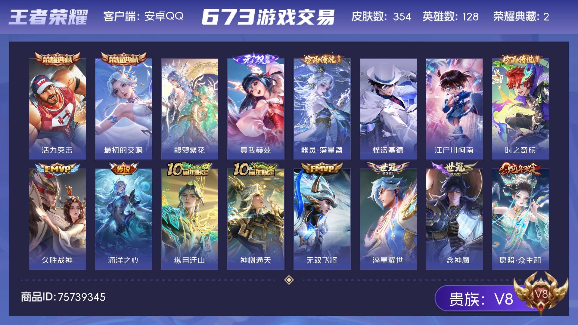 V8 皮肤354 英雄128 至尊星耀 荣耀典藏2 珍品无双1 无双皮肤1 珍品传说4 传说28 其他皮肤324
