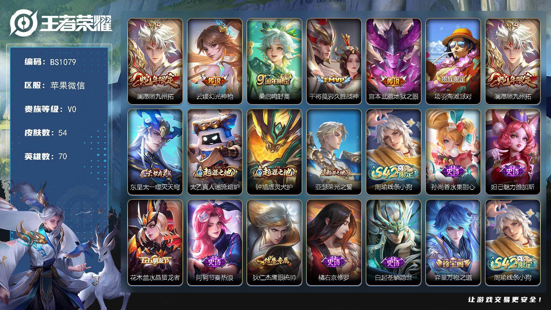 低场次小号!苹果WX-至尊星耀III段位-70英雄-54皮肤-5传说-8史诗