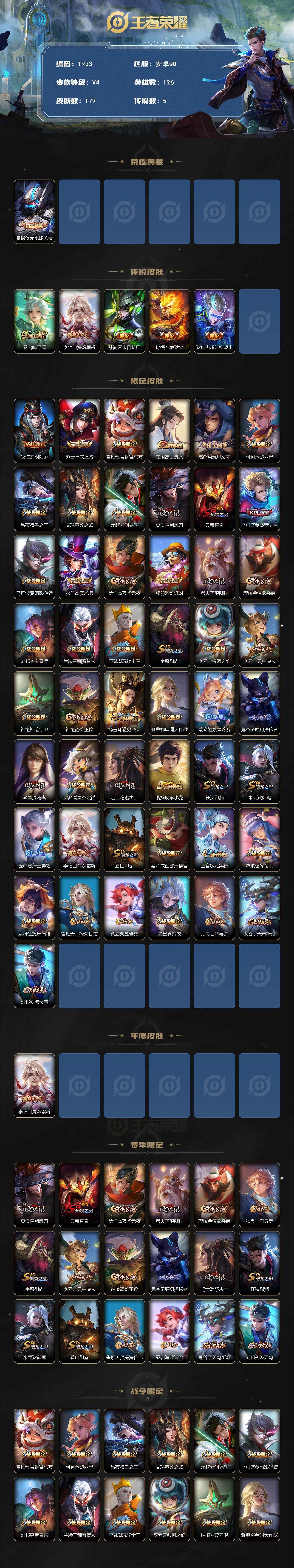 安卓QQ 皮肤179 英雄126 典藏1 传说5 其他皮肤71 至尊星耀-