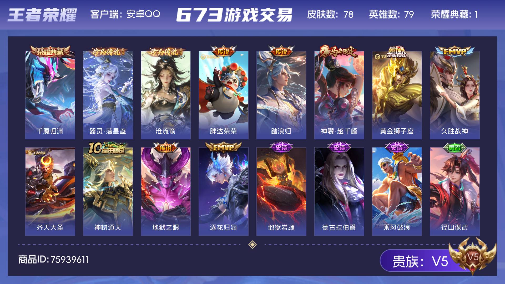 V5 皮肤78 英雄79 非凡王者 荣耀典藏1 珍品传说2 星传说2 传说9 其他皮肤72