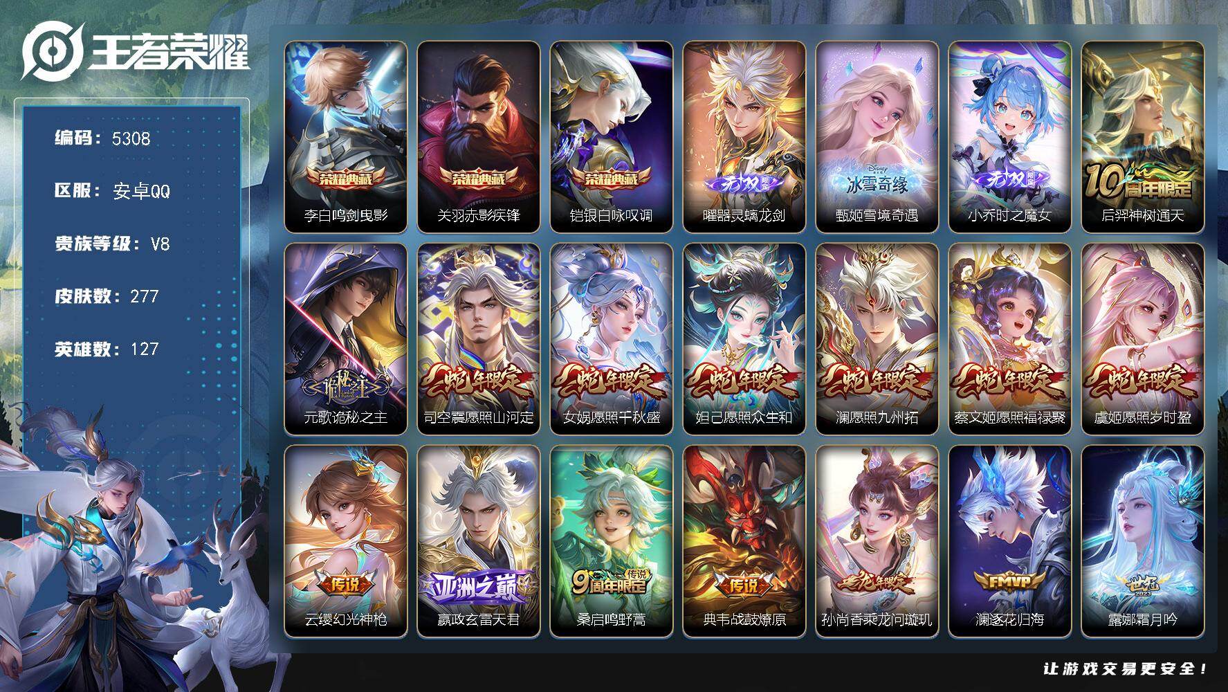 V7 11传说 127英雄 163皮肤 可修改实名 男号