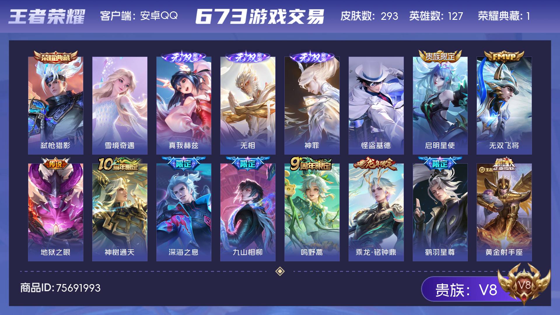 V8 皮肤293 英雄127 荣耀王者 荣耀典藏1 无双皮肤4 珍品传说1 传说15 其他皮肤278