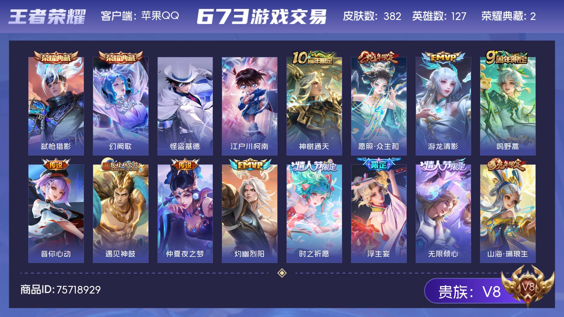 V8 皮肤382 英雄127 至尊星耀 荣耀典藏2 珍品传说2 传说25 其他皮肤359