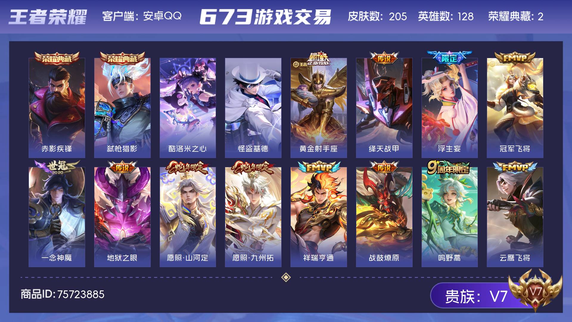 V7 皮肤205 英雄128 至尊星耀 荣耀典藏2 珍品传说2 传说13 其他皮肤192