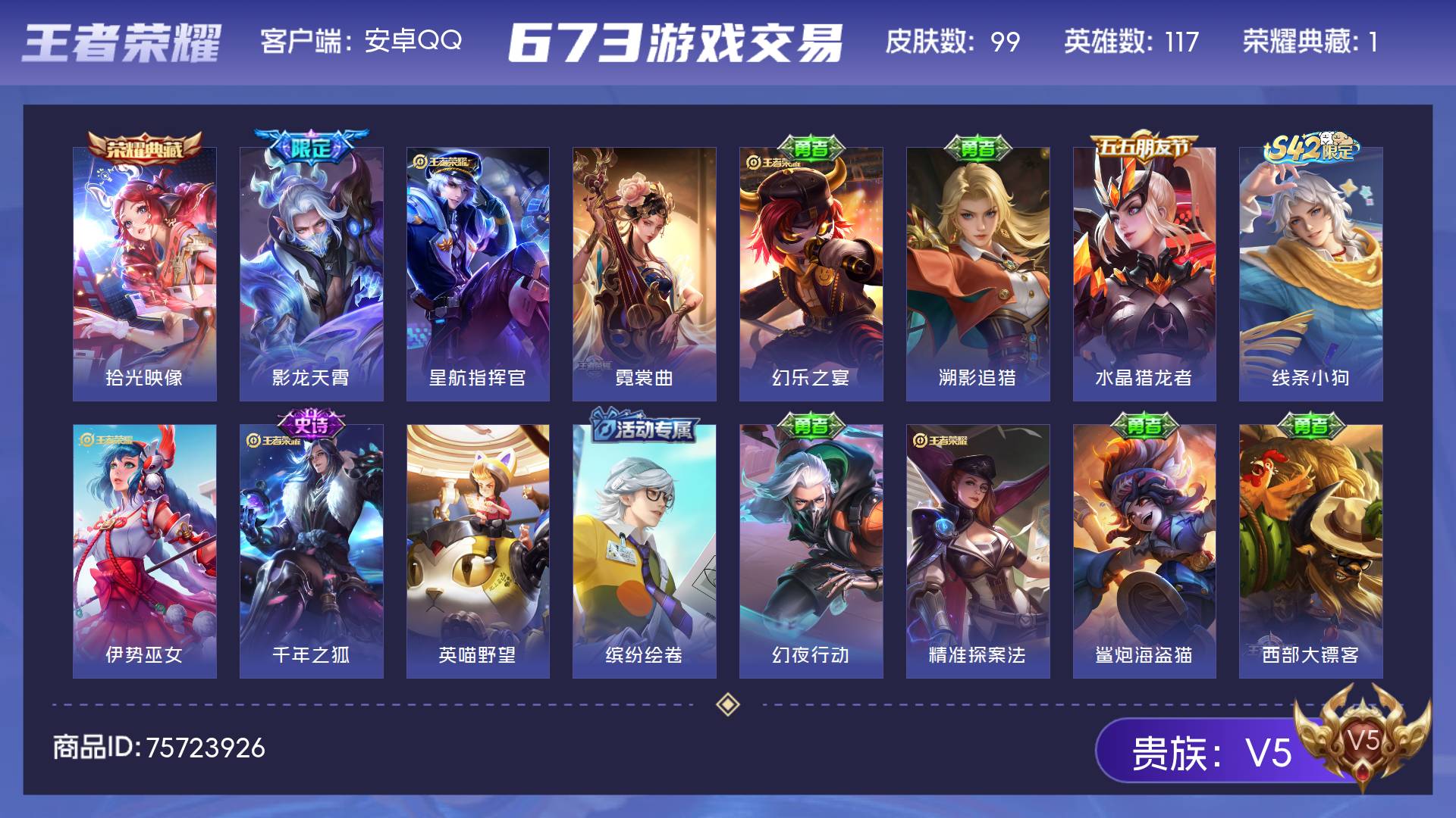 V5 皮肤99 英雄117 永恒钻石 荣耀典藏1 传说1 其他皮肤103
