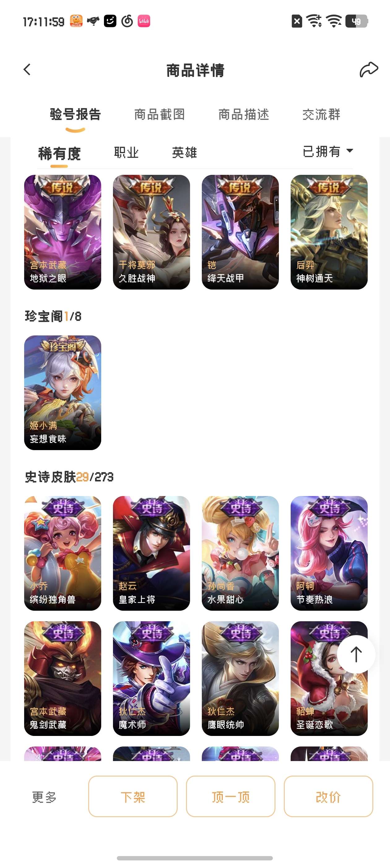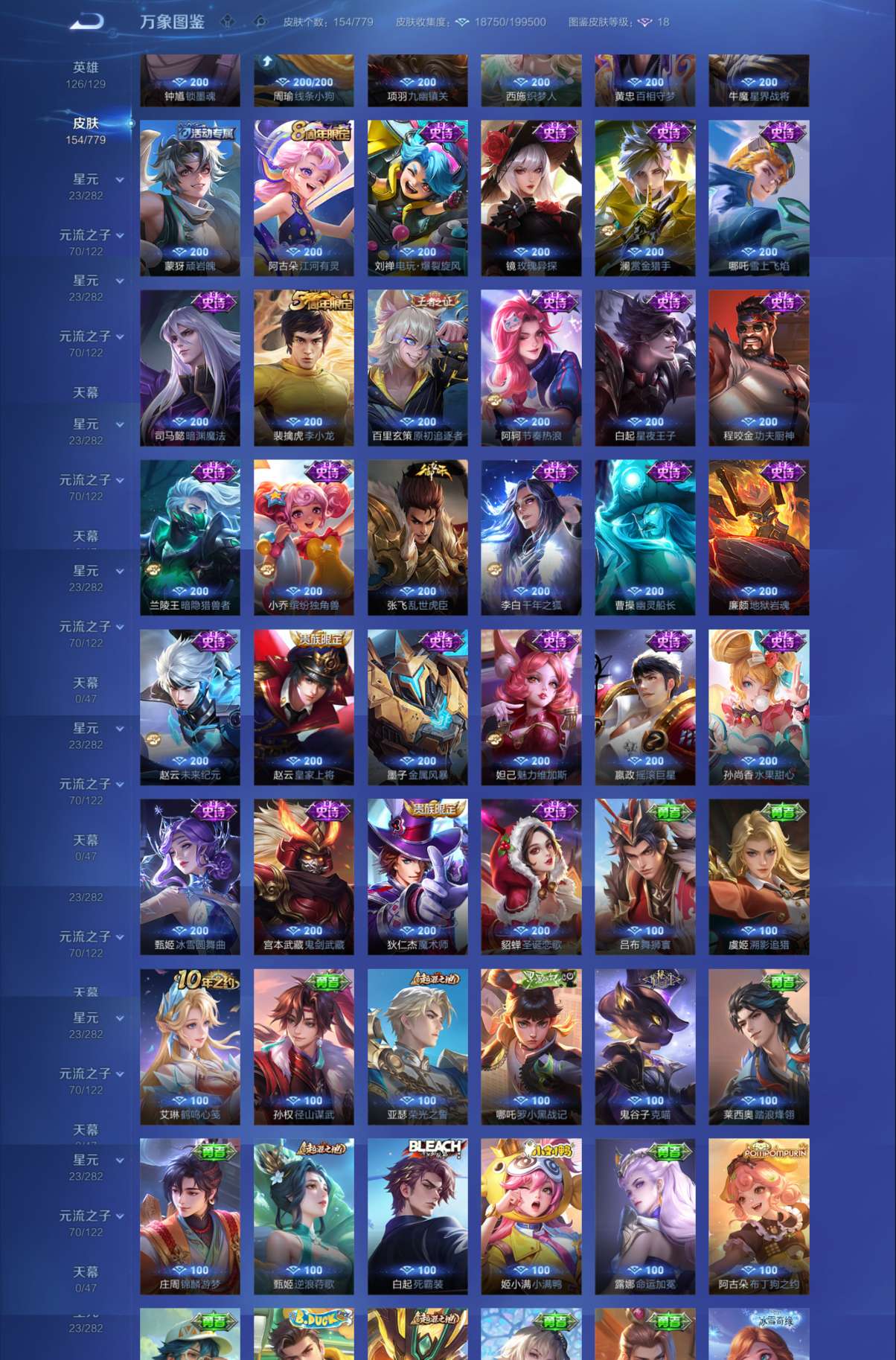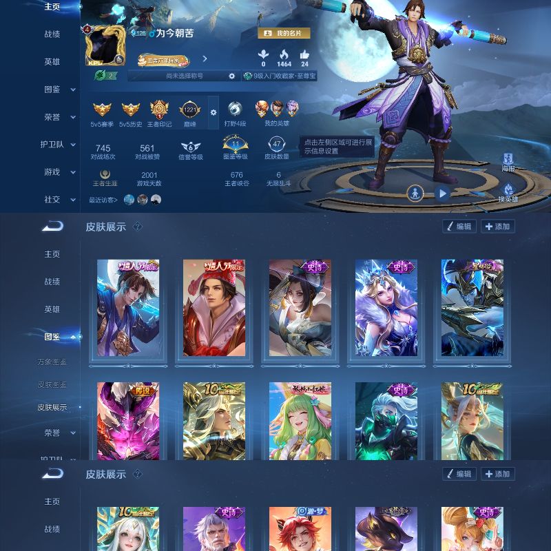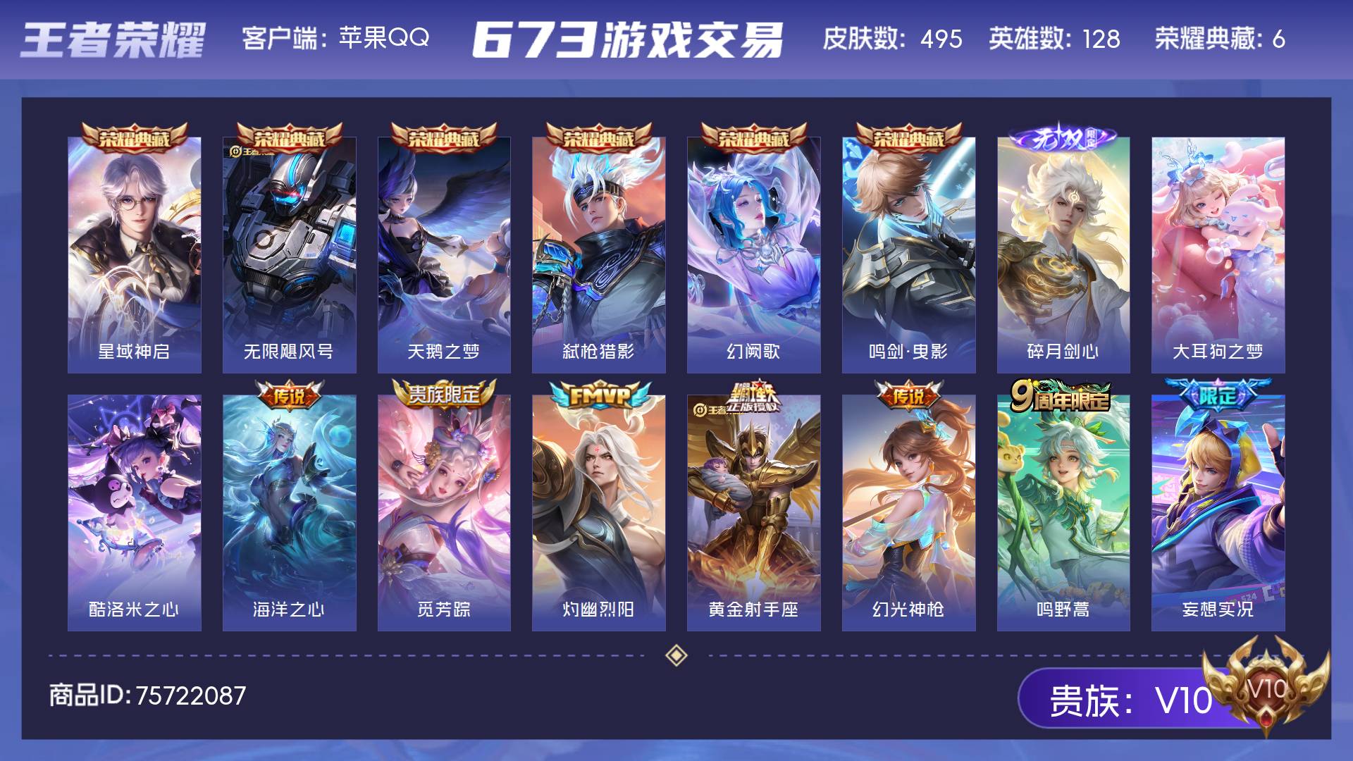 V10 皮肤495 英雄128 至尊星耀 荣耀典藏6 无双皮肤1 珍品传说2 传说49 其他皮肤441