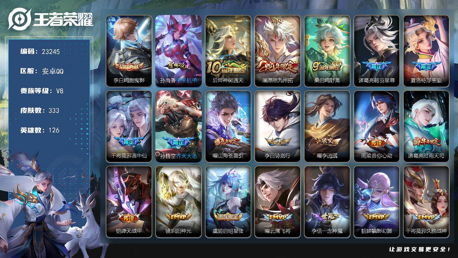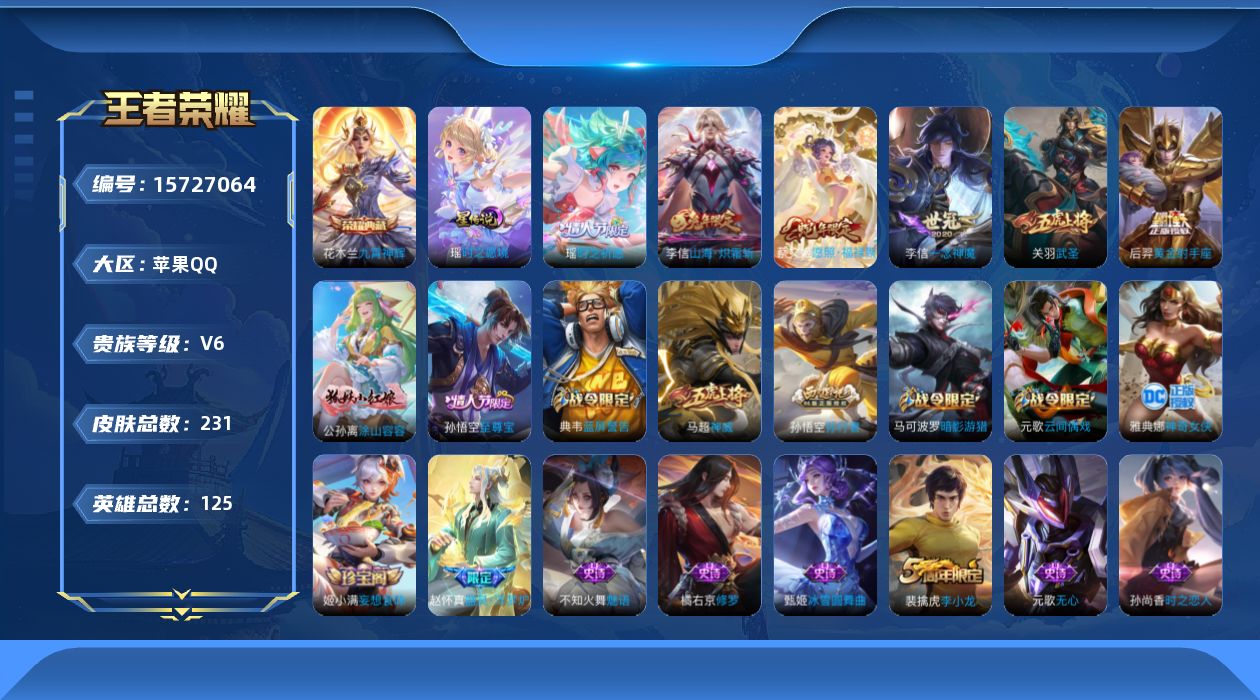 苹果Q-V8-至尊星耀V段位-129英雄-341皮肤-2典藏皮肤-1典藏英雄-1无双-18传说-84